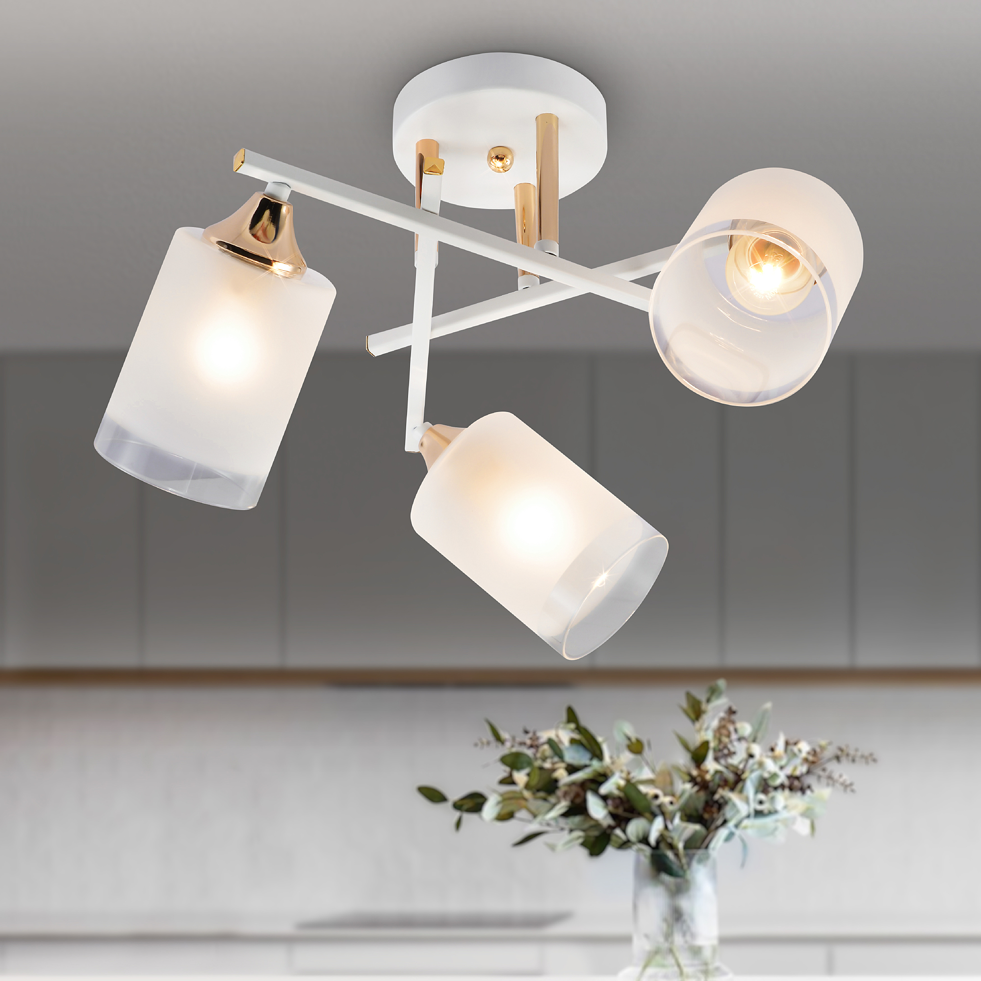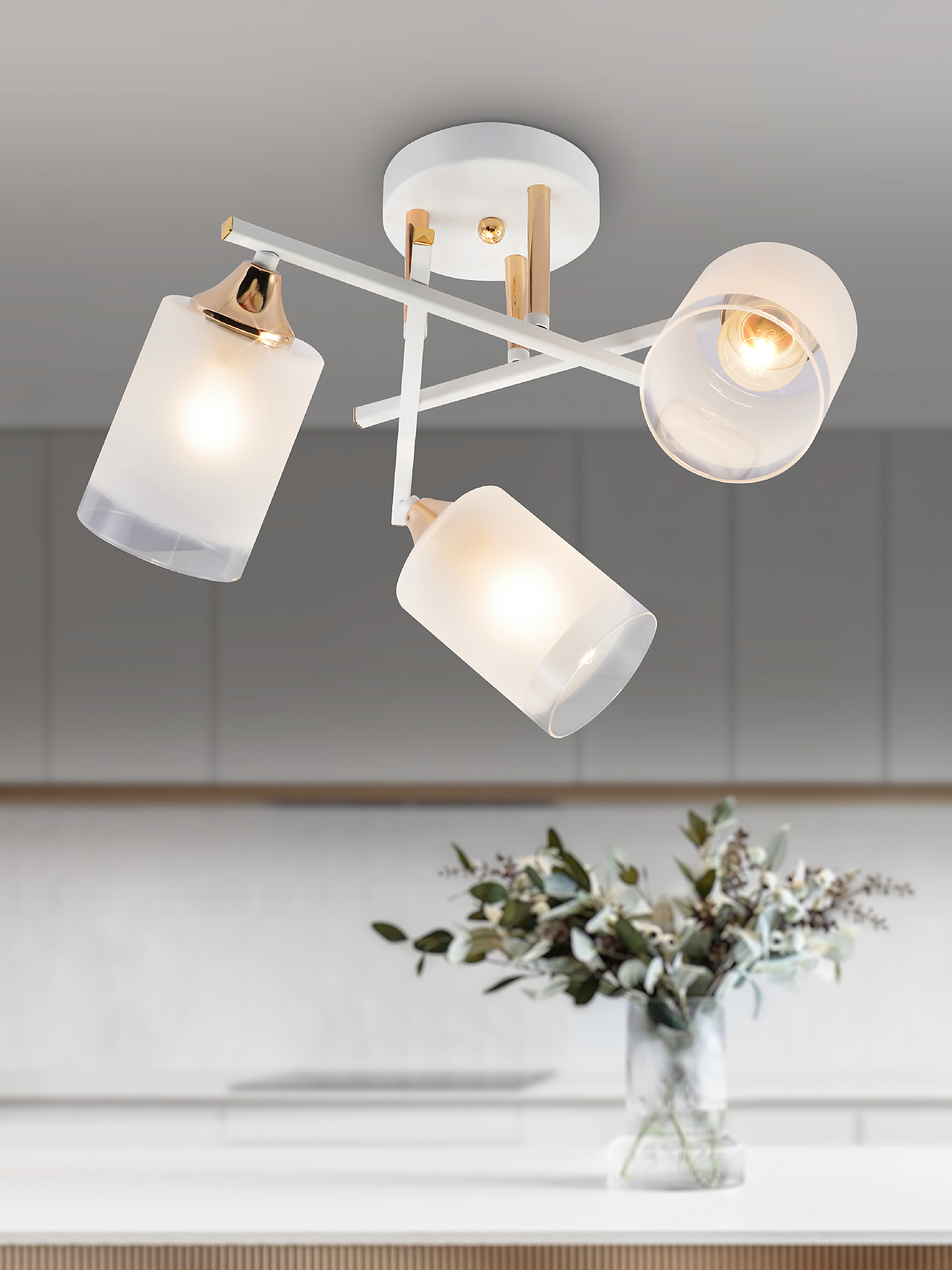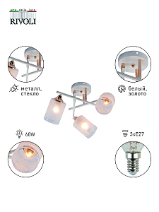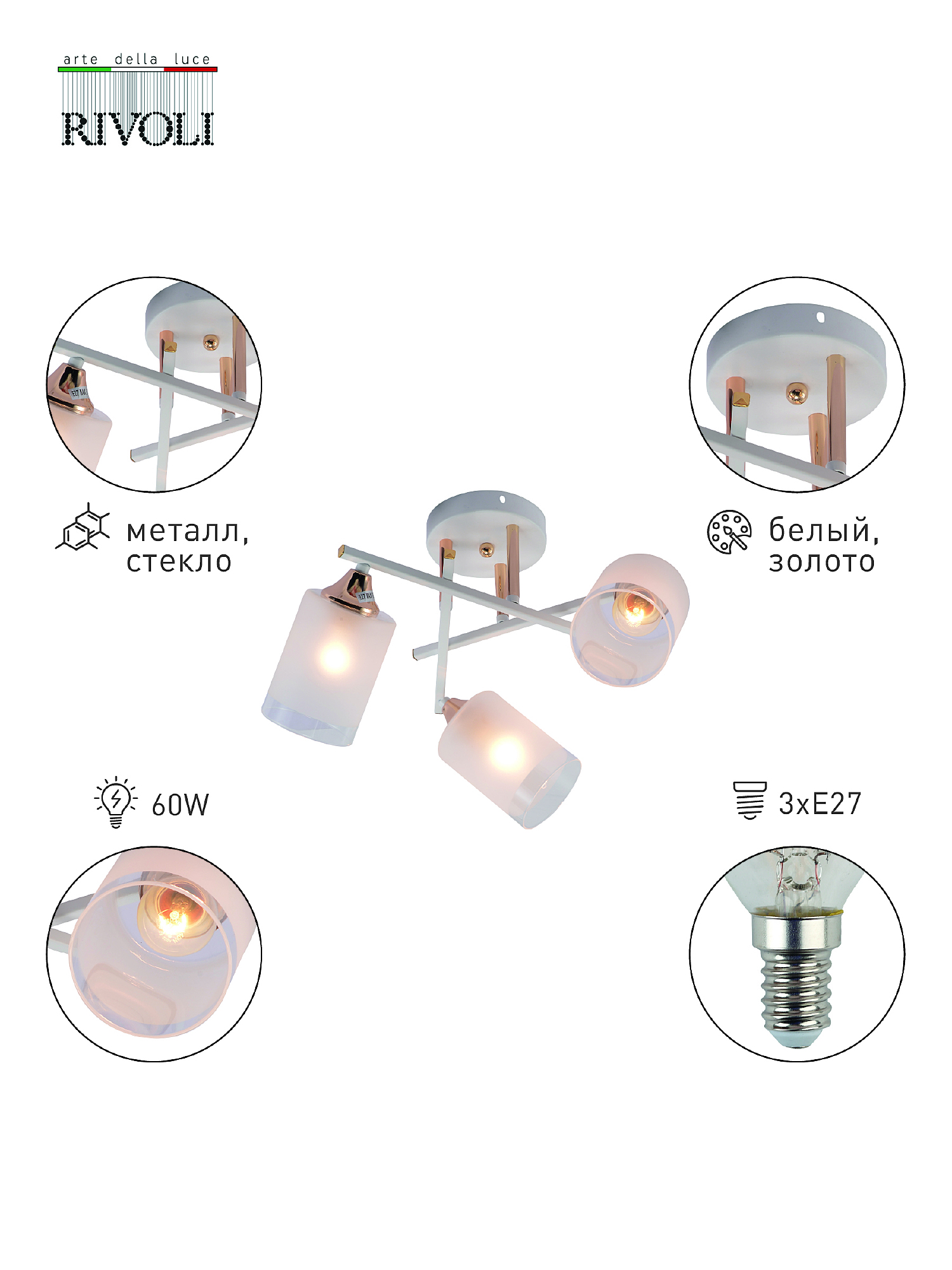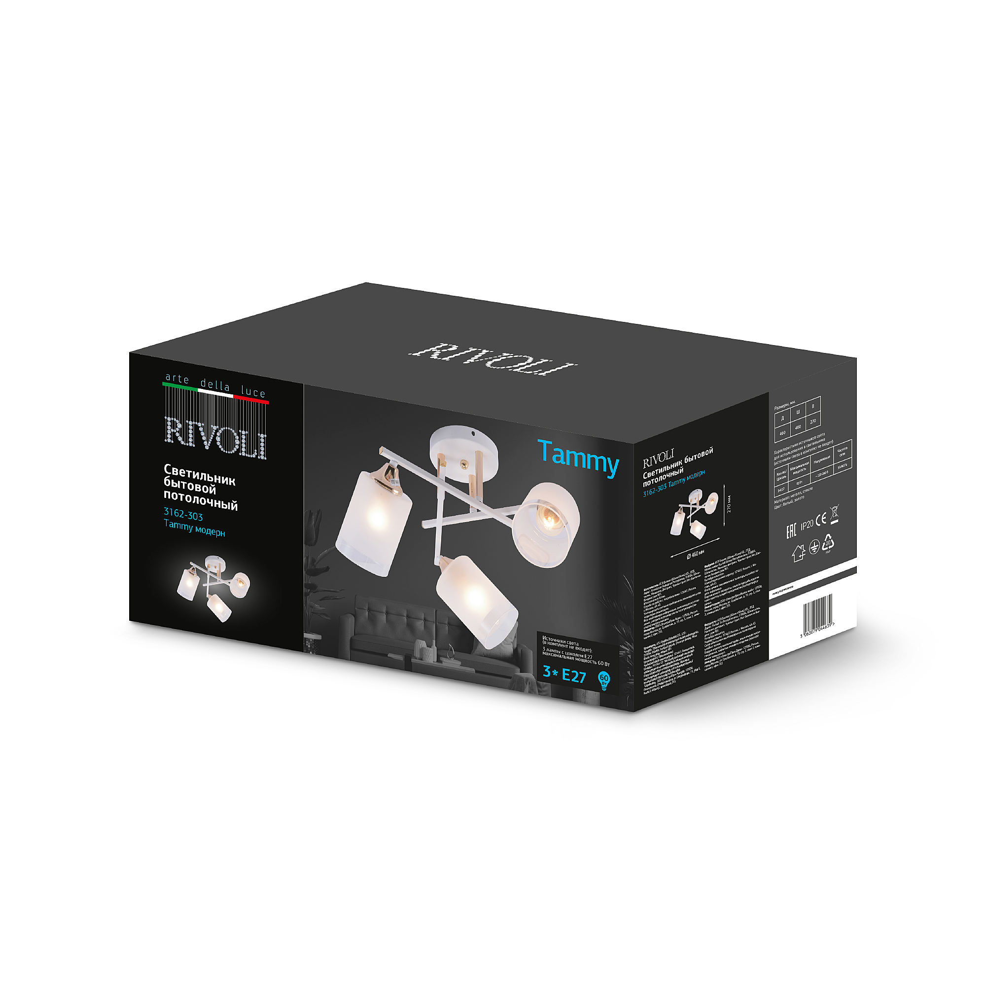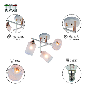 Люстра Rivoli Tammy (арт. 3162-303) в белом цвете с декоративными элементами золотого цвета. Стиль люстры – модерн. Количество плафонов – 3. Люстра потолочная Tammy применяется с лампами Е27 60 Вт. Плафоны из белого матового стекла расположены на лаконичных рожках в виде перекрёстных металлических реек. По краю плафоны люстры декорированы прозрачной полосой. Корпус дизайнерской люстры изготовлен из лёгкого прочного металла. Основание круглое, люстра быстро монтируется накладным способом на любой потолок. Люстра на эффектных коротких штангах подходит для невысоких потолков. Дизайн люстры создавался так, чтобы эта модель была универсальна для любого интерьера.