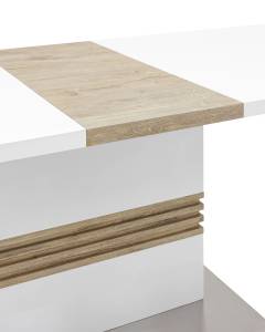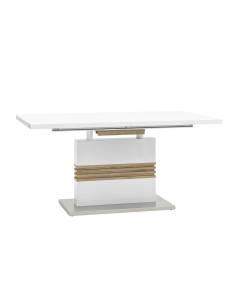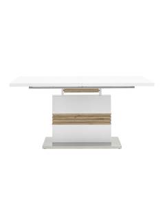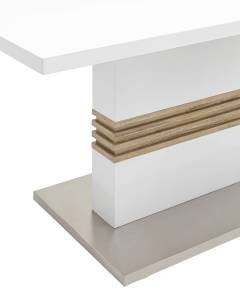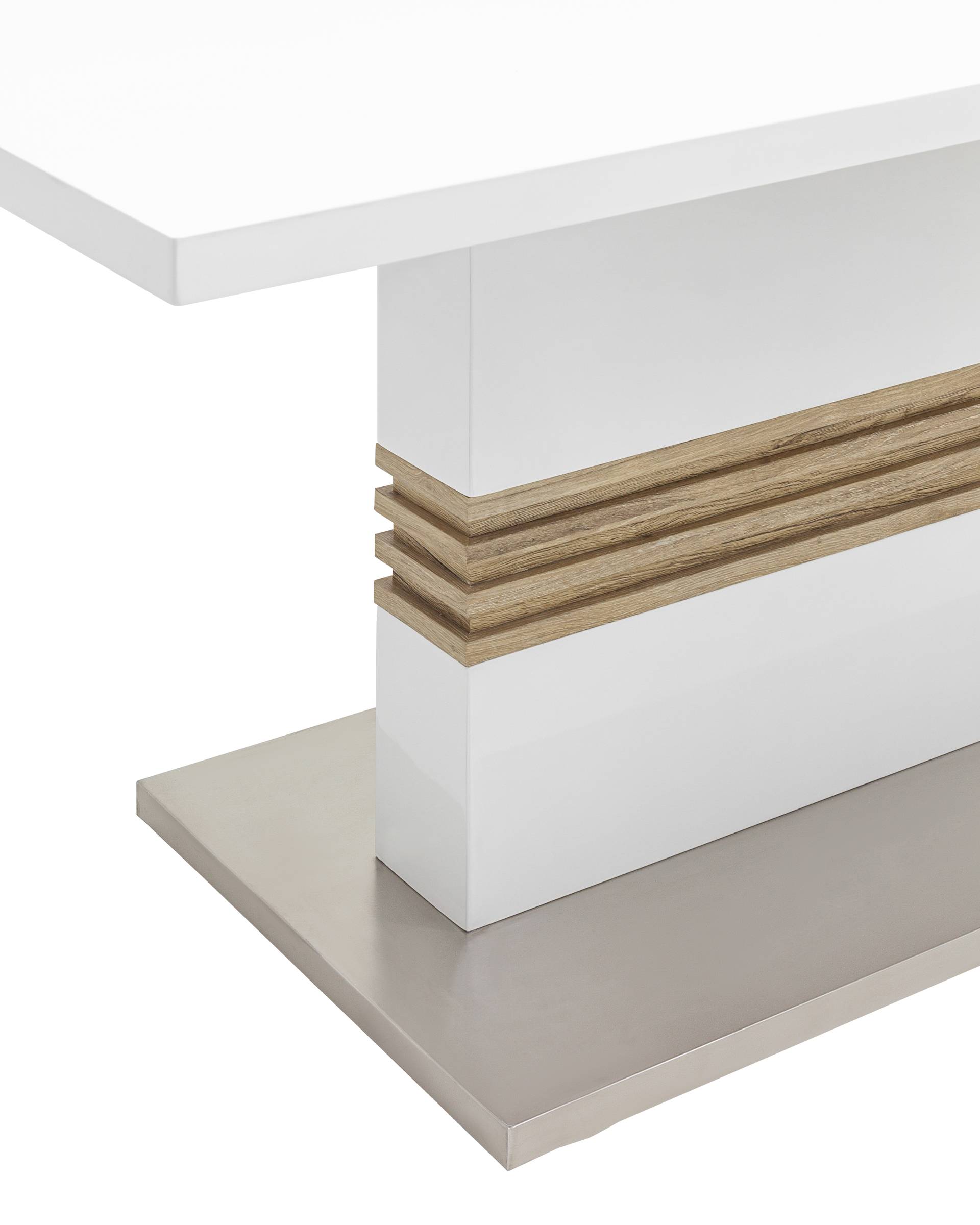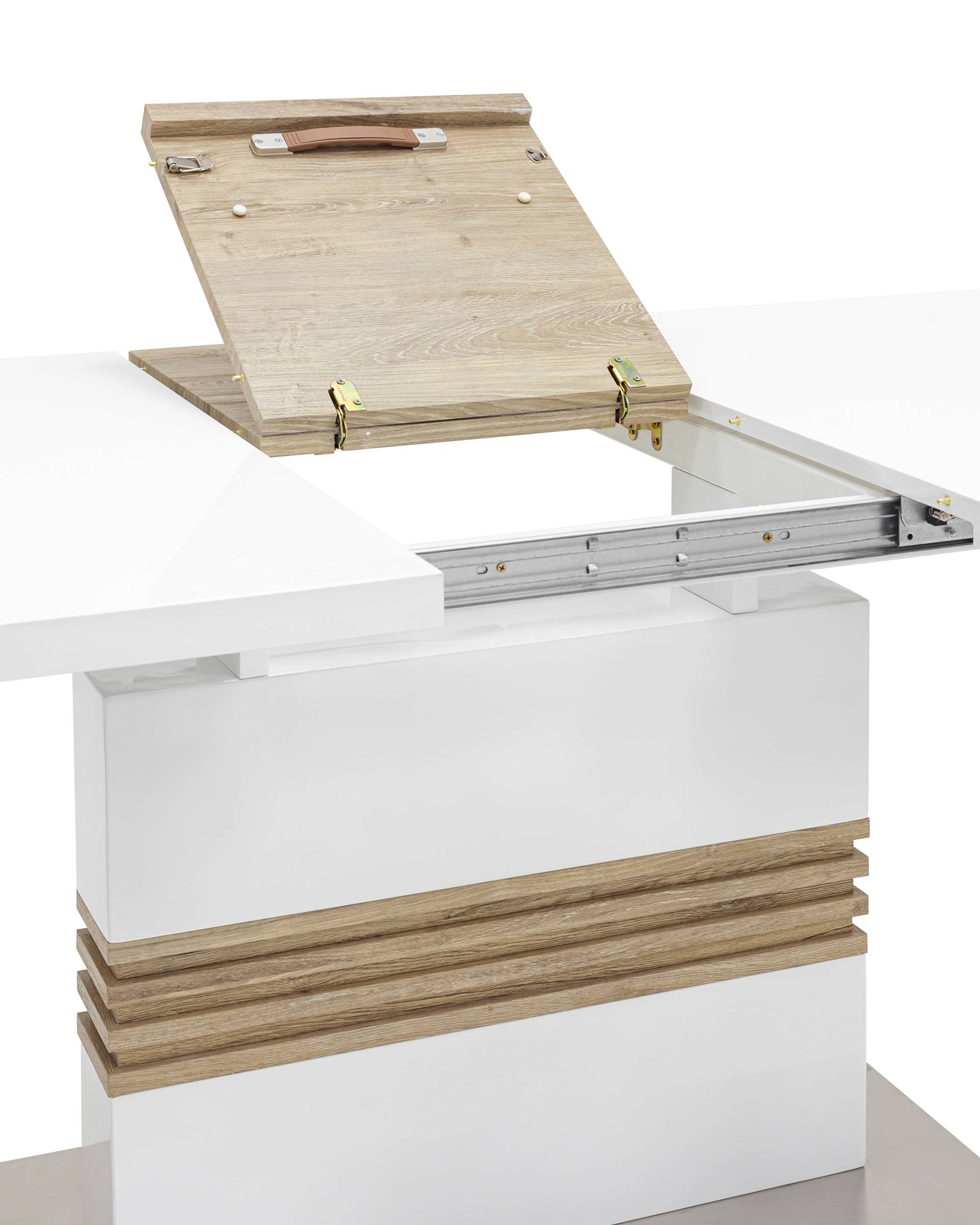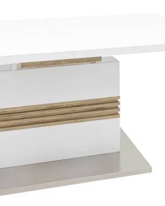 <p>Обеденный стол раскладной.</p><p>Столешница выполнена из прочного и долговечного МДФ. Светлая глянцевая поверхность столешницы гармонично сочетается с черными металлическими ножками. Красивая форма стола позволит легко вписать его в современный интерьер, стол украсит кухню, гостиную или современное кафе, ресторан.</p><p>Дополнительная вкладка стола выполнена из МДФ с бумажным шпоном цвета беленого дуба. На вкладке предусмотрена петля для комфортного открытия стола одной рукой.</p>