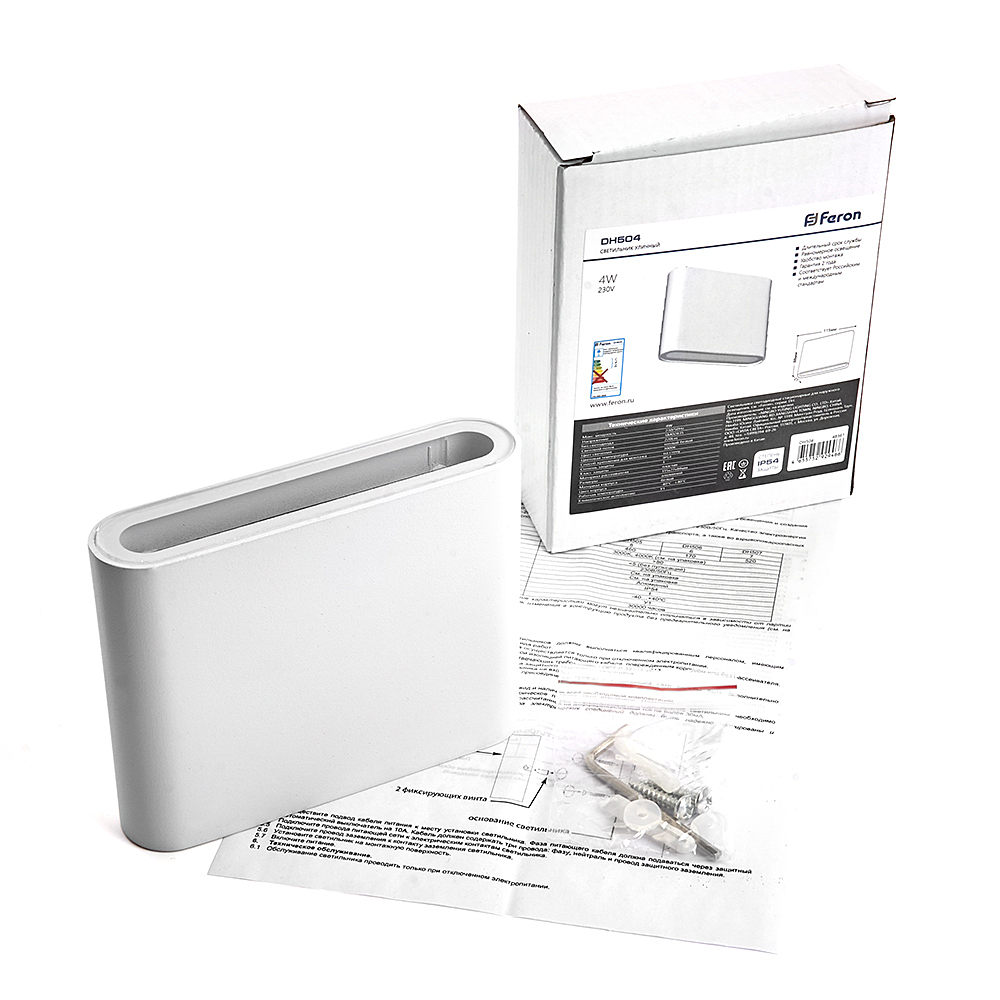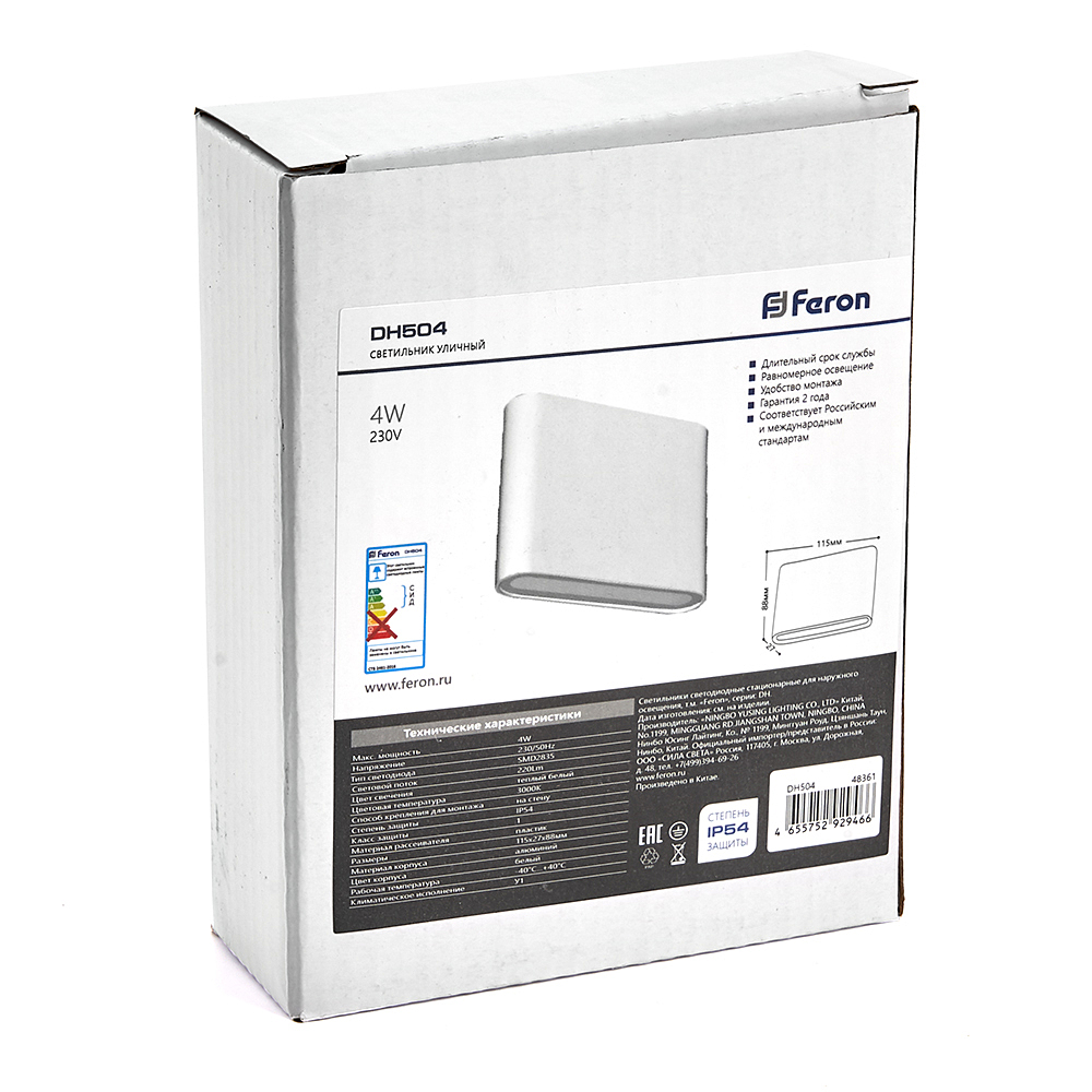 Светильник уличный светодиодный, на стену (ДБУ) FERON DH504, серия Техно, 4W, 3000К (теплый белый), 230V/50Гц, 220Lm, IP54,*SMD2835, класс защиты 1, раб.t -40градусов...+40градусов, цвет белый, корпус алюминий, 115*27*88мм,