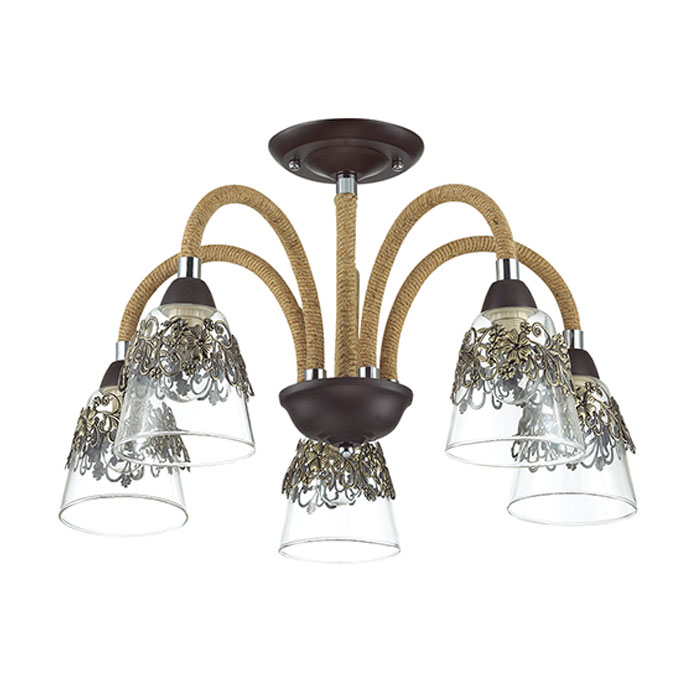 Люстра потолочная 3252/5C серии TEONA оформлен в классическом стиле. Люстра состоит из стеклянных прозрачных плафонов с ажурным металлическим декором и арматуры кофейного цвета с хромовыми вставками, украшенной канатной нитью. Свежая, оригинальная, стильная модель сочетает в себе все тренды этого сезона. Цоколь E14. Мощность 5*60W. Нет ламп в комплекте.