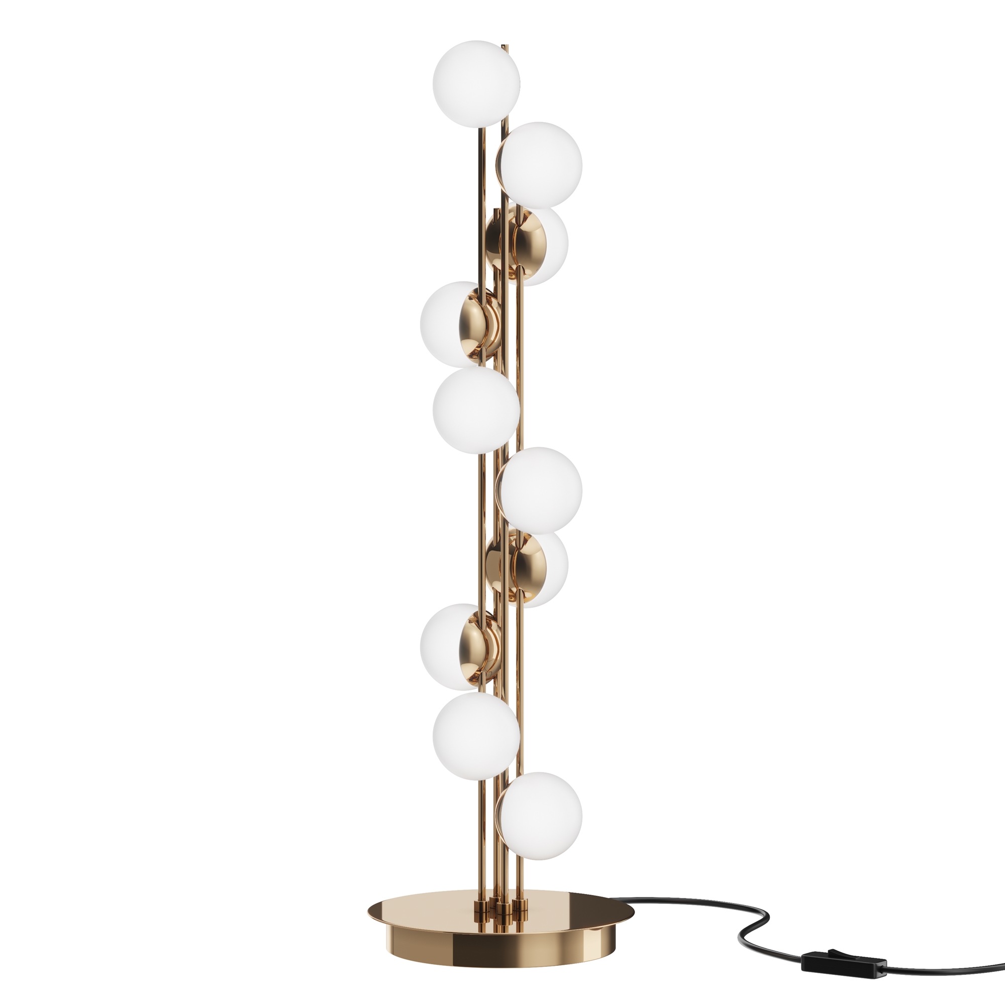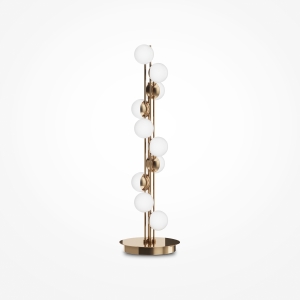 Широкая окружность, обрамленная ?молекулами? света,обеспечивает максимально равномерное и яркое освещениепространства. ?Атомный? или ?молекулярный? дизайн,отражающий естество и природную сущность каждого предмета,не теряет актуальности и позволяет выгодно расставлять акцентыв интерьере. Одна из характерных черт подобных светильников - невесомость конструкции. За счет тонких, практически невидимыхтросов, которые регулируются по высоте, создается ощущение, что люстра парит в воздухе. Металлическая золотая арматура и матово-белые миниатюрные плафоны с легкостью дополнят любую палитру, а представленные в коллекции подвесная люстра и бра станут готовым ансамблем для освещения гостиной, спальни, прихожей.