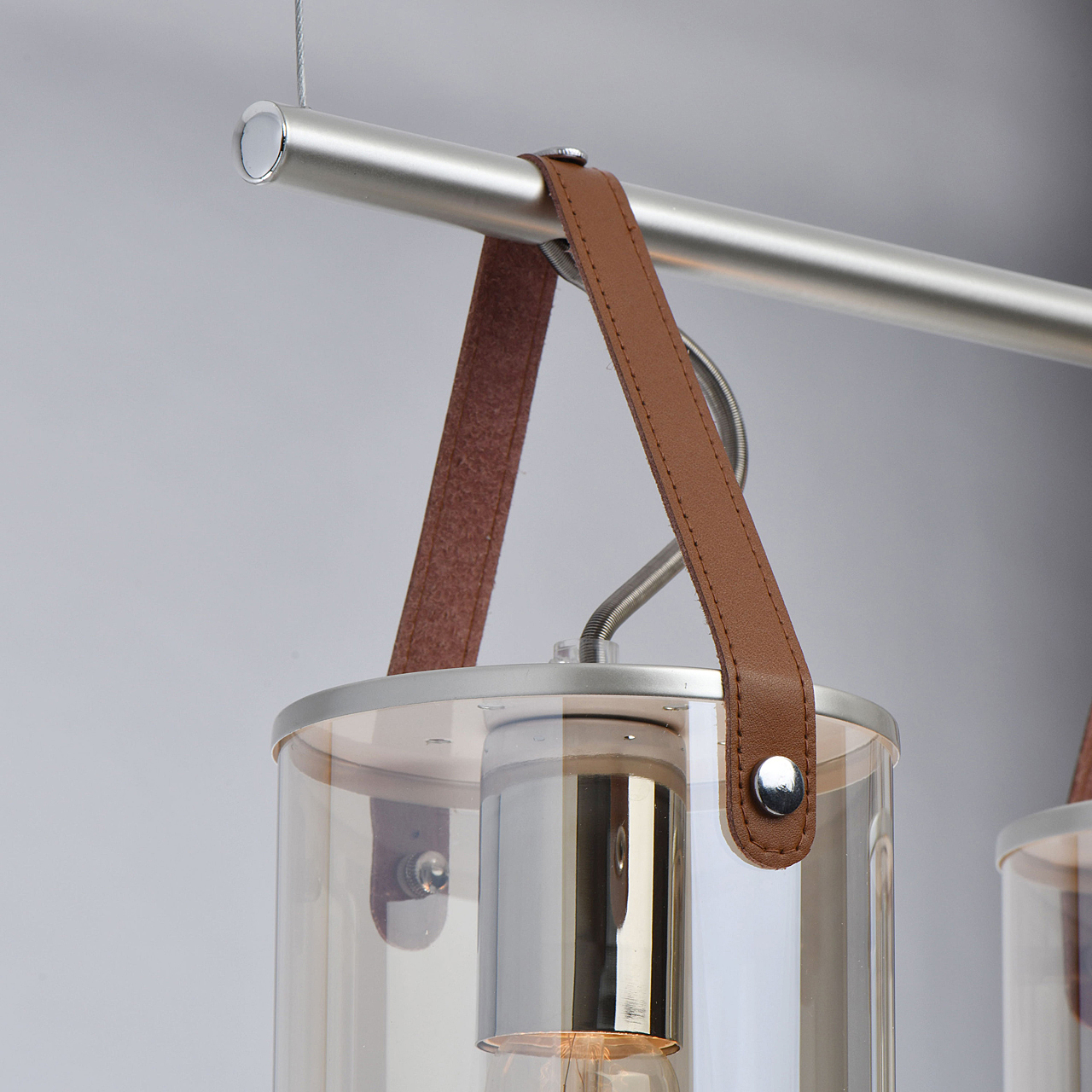 Оригинальная конструкция подвесов в виде парящей планки.Притягательный цвет шампань является трендом в дизайне интерьеров.Необычное крепление плафонов на кожаных ремешкахПолная семья для общего и зонального освещения.