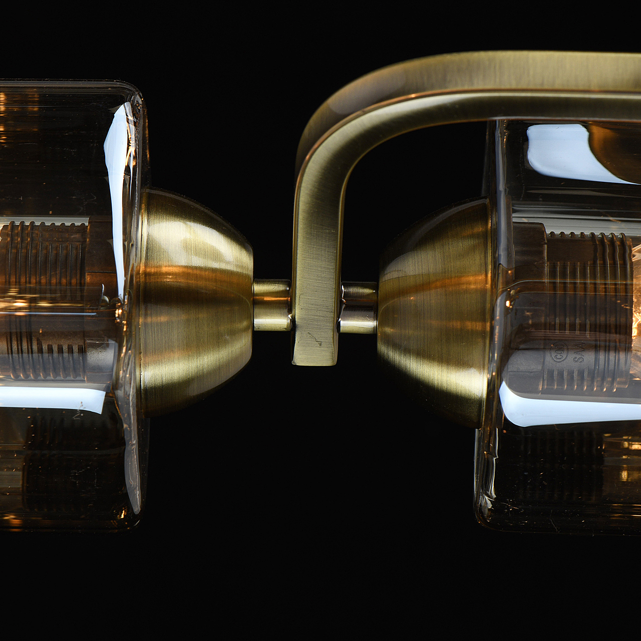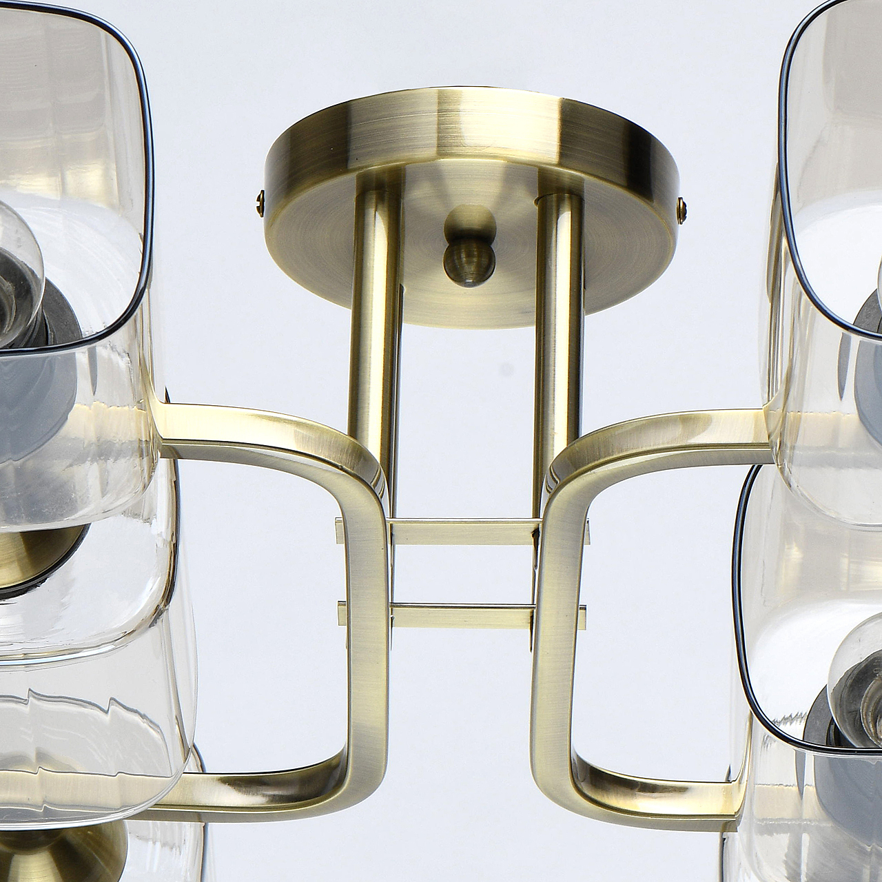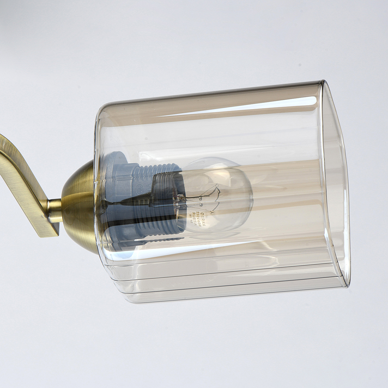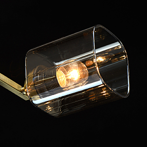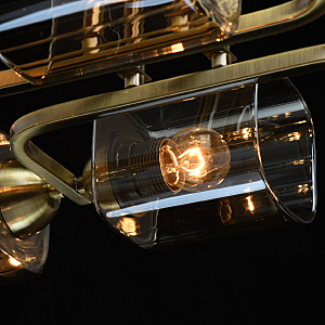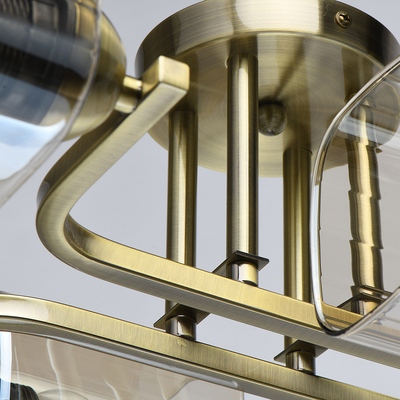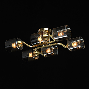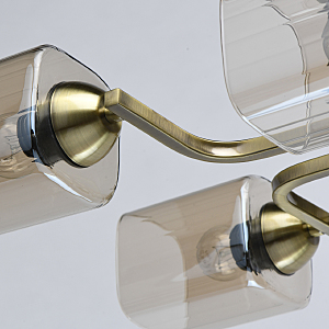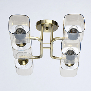 Геометрические формы конструкции поддержаны плафонами в мягкой квадратной форме.Основание светильника выполнено в популярном цвете античной бронзы.Компактная высота модели идеальна для стандартной высоты потолка.Плафоны тонированного стекла цвета топаза создают мягкое освещение.Полная семья из бра и потолочных светильников на 6 и 8 ламп.