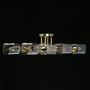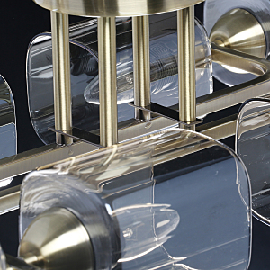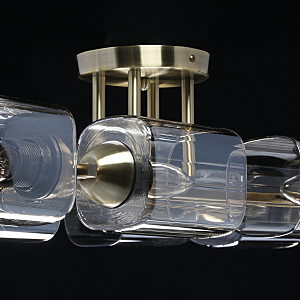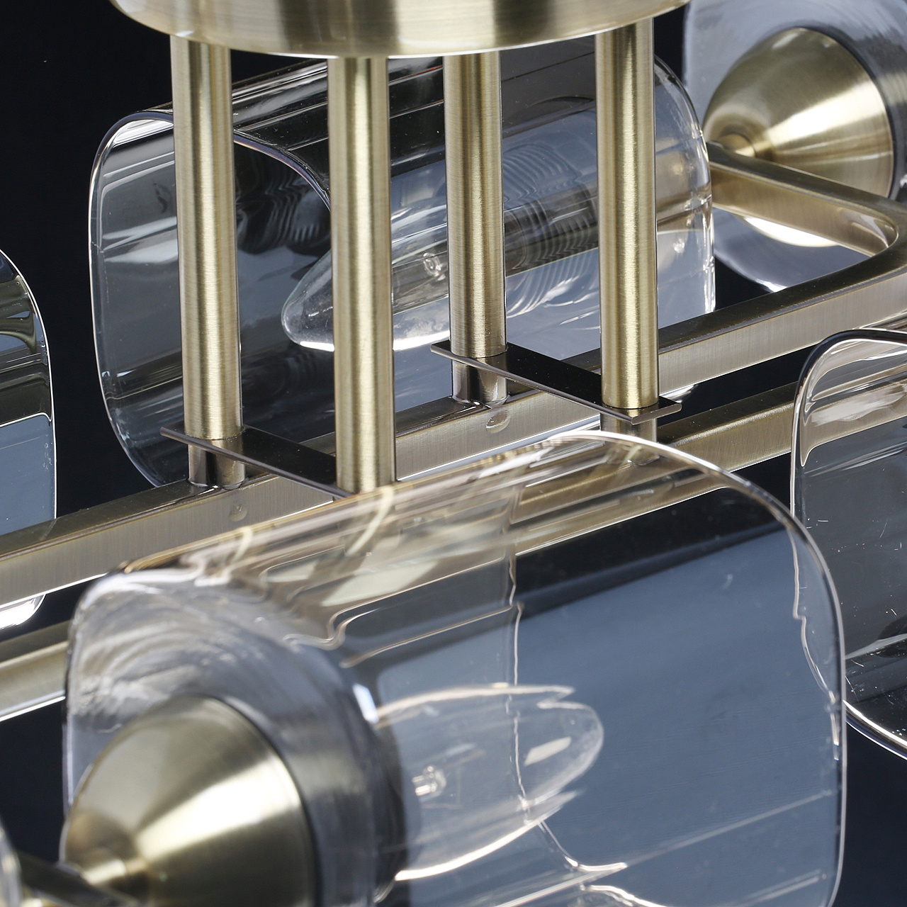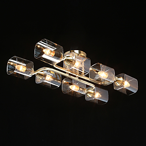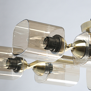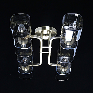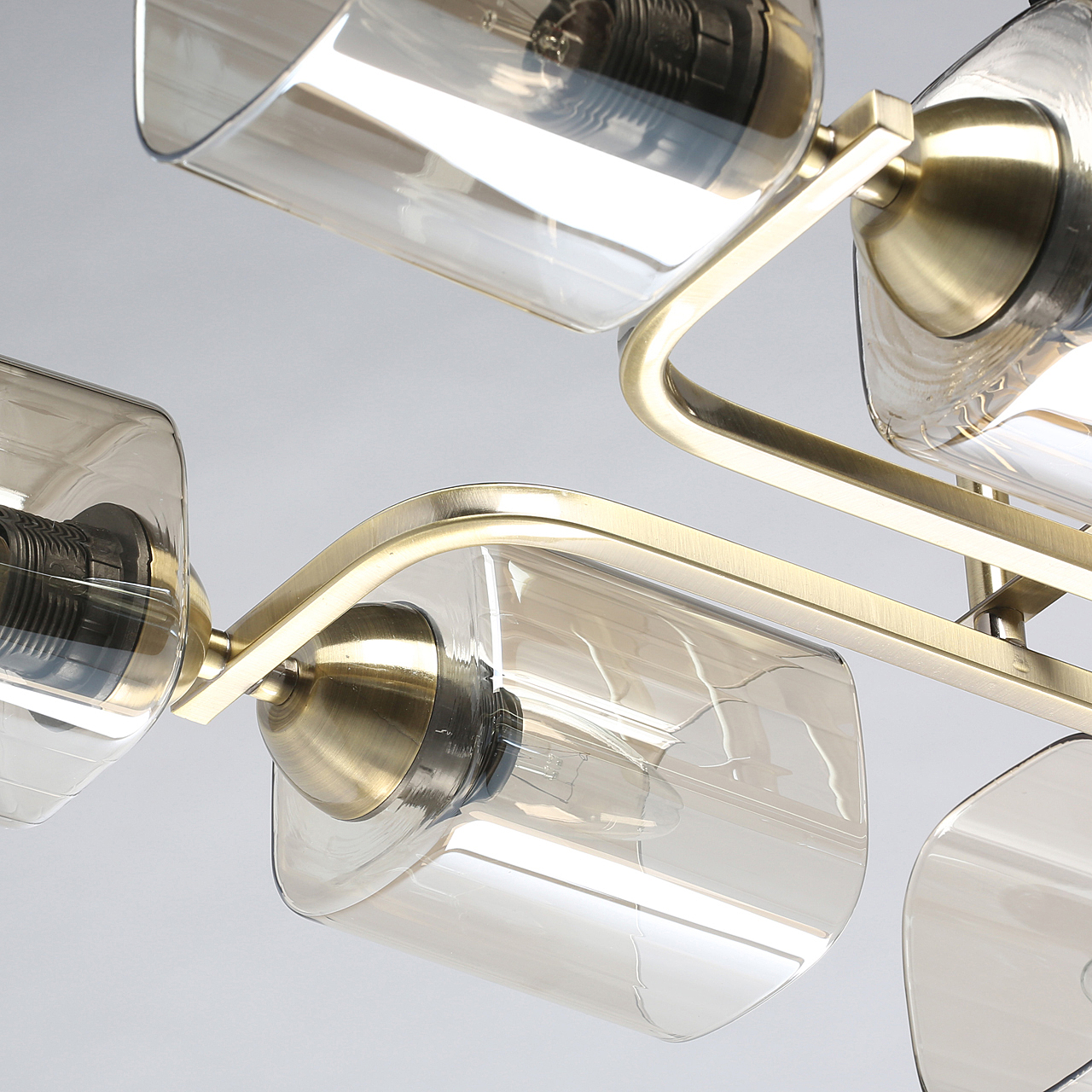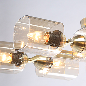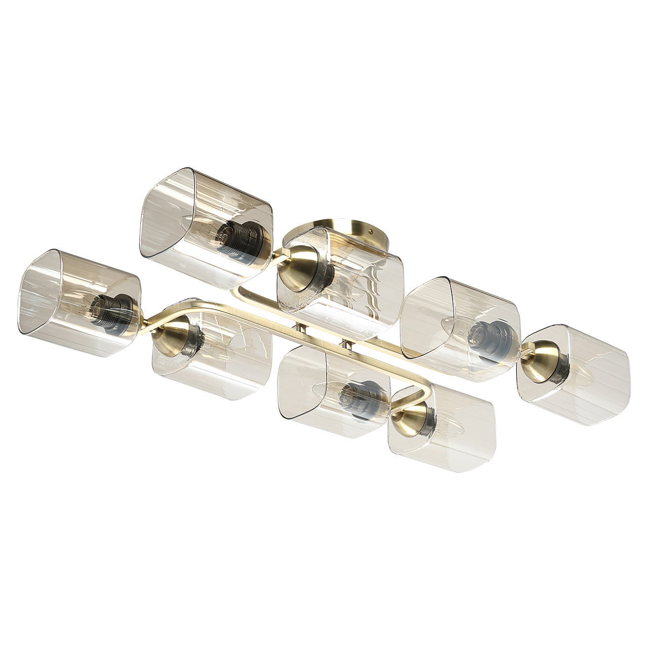 Геометрические формы конструкции поддержаны плафонами в мягкой квадратной форме.Основание светильника выполнено в популярном цвете античной бронзы.Компактная высота модели идеальна для стандартной высоты потолка.Плафоны тонированного стекла цвета топаза создают мягкое освещение.Полная семья из бра и потолочных светильников на 6 и 8 ламп.