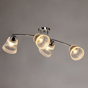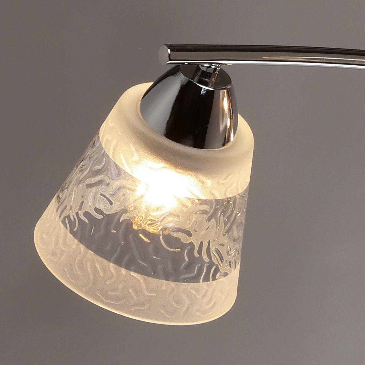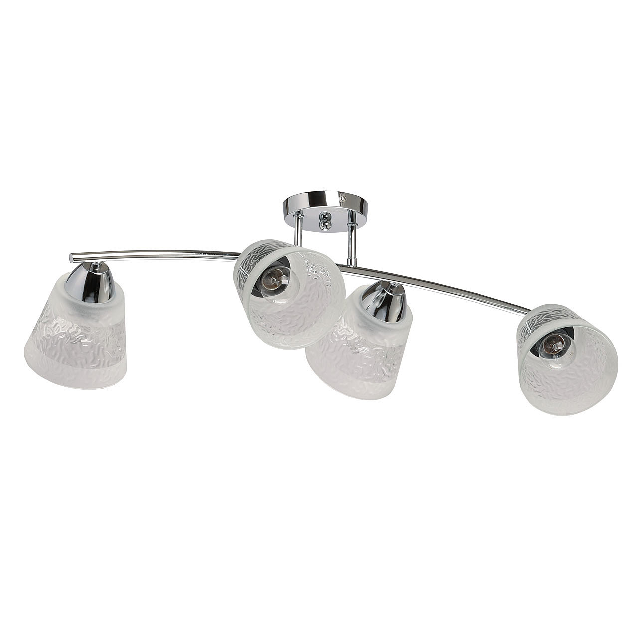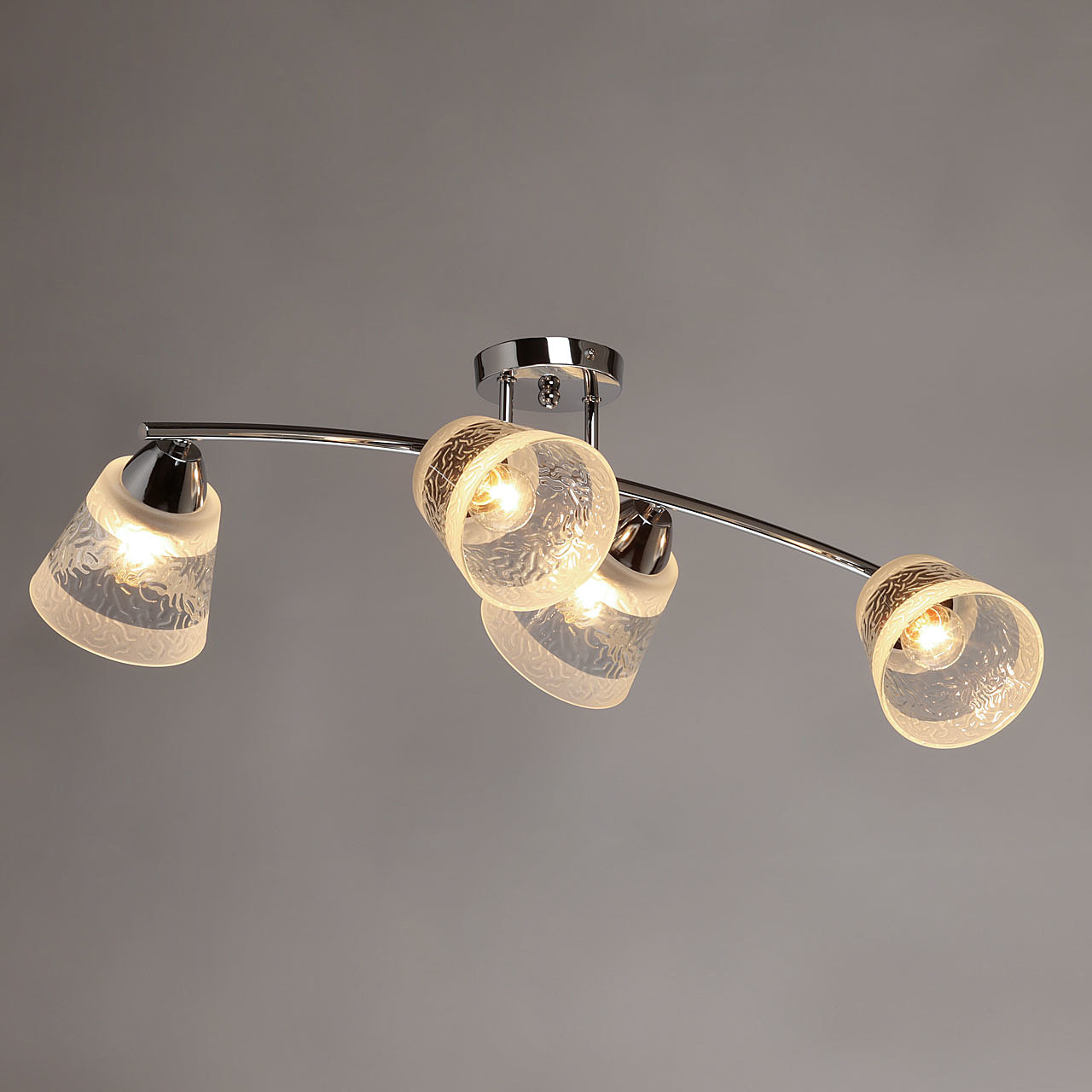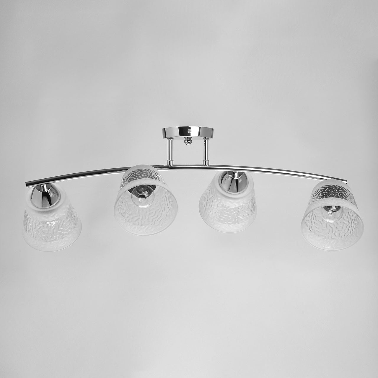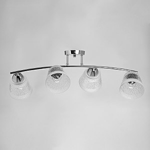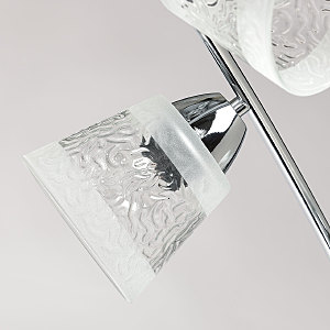 Металлическое основание потолочной люстры гальванизировано в цвет хрома. Стеклянные фактурные плафоны матированы по трафарету.