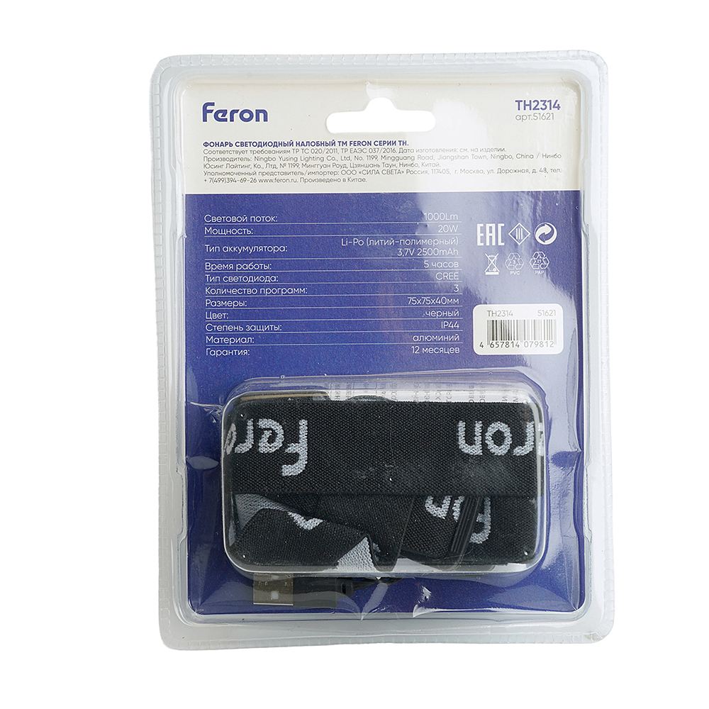 Фонарь с аккумулятором FERON TH2314 фонарь головной , 1LED IP44, аккумулятор 3,7/2500mAh/Li-Ion (литий-ионный), количество режимов 3, время зарядки 2 часа, время работы 5 часов , цвет черный, 75*75*40мм