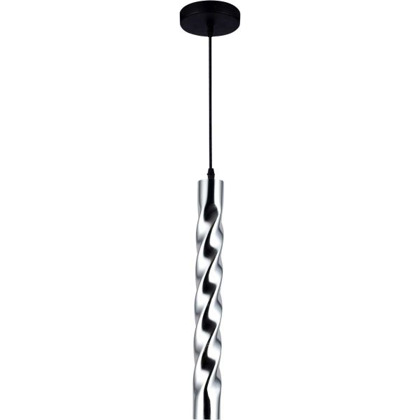 Светильник подвесной из коллекции Thrill имеет металлическую потолочную чашу, окрашенную в черный цвет, и перекрученный металлический плафон, гальванизированный в цвет хрома.