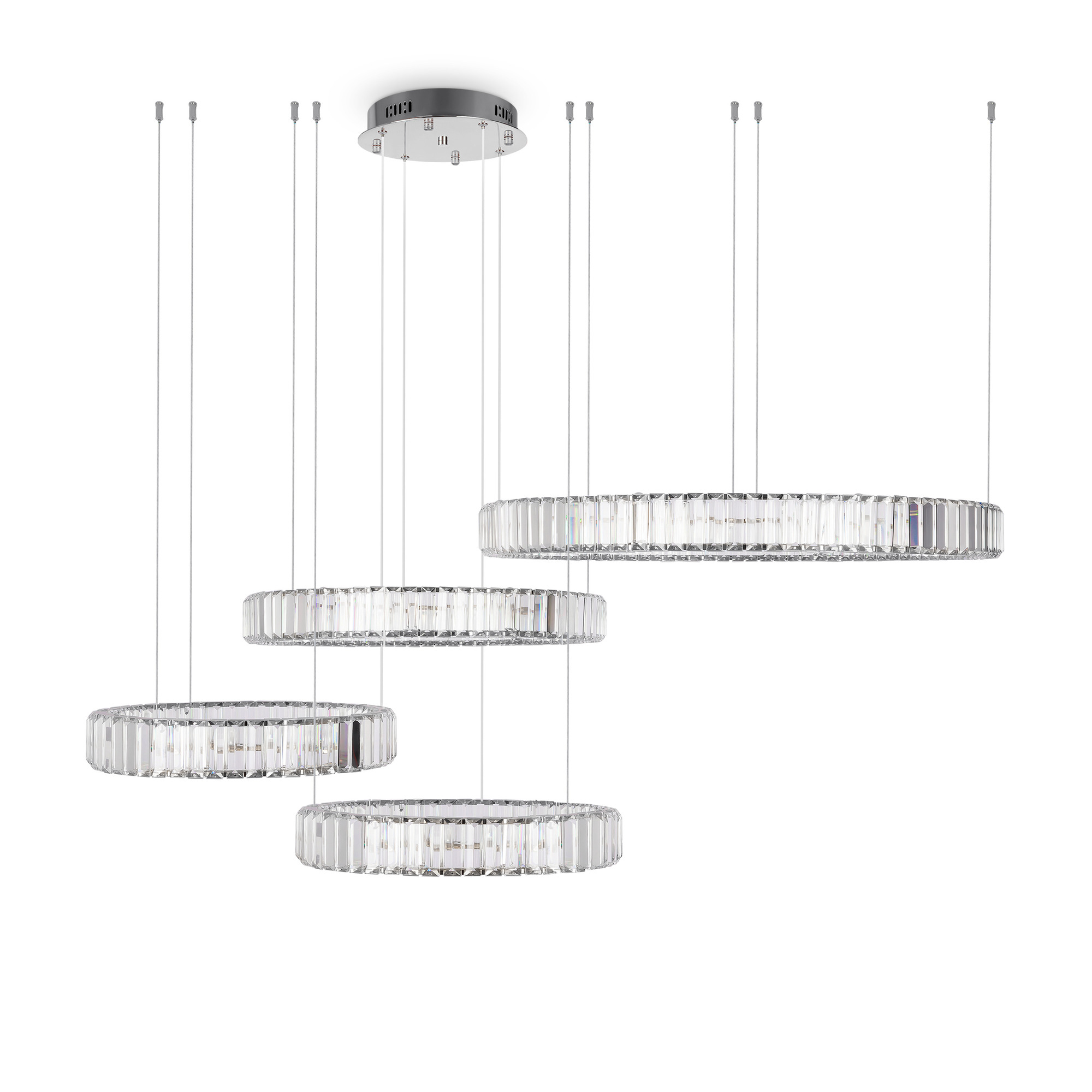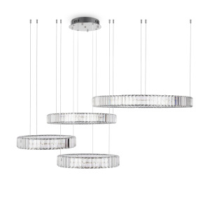 Металлическая арматура в цвете латунь и хром.Хрустальные декоративные кольца с геометричными гранями. LED-источник света. Регулировка цветовой температуры (3000-4000-5000K)и яркости 4G-dimming при помощи пульта (в комплекте).