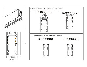 Трековые системы Magnetic standard 48V 10mm для накладного монтажа может крепиться к потолку накладным способом с помощью крепежа (GL1995), подвешиваться с помощью подвесов (GL1999). Шинопровод подключается и работает через блок питания 48V. Декоративный экран, торцевые заглушки идут в комплекте. Дополнительные аксессуары: Блок питания, подвод питания, соединительные элементы приобретаются отдельно.