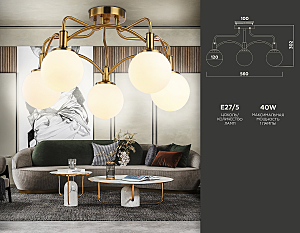 Допускается отличие страны-изготовителя, указанной в характеристиках. Линии производства могут находиться в нескольких государствах. Это не влияет на качество изготовления товара: все заводы данного бренда работают по общим стандартам, а готовые изделия проходят соответствующий контроль.Россия Коллекция Traditional ЦветЦвет арматуры Золото Цвет Золото Материал арматуры Металл Цвет плафона белый матовый Материал плафона Стекло РазмерыВысота (мм) 302 Диаметр (мм) 560 Ширина (мм) 560 ЭлектрикаКоличество ламп (шт) 5 Цоколь E27 Мощность лампы (Вт) 40 Напряжение (В) 220 Площадь освещения 14 Дополнительная информацияСпособ крепления Планка Степень защиты (IP) IP20 -