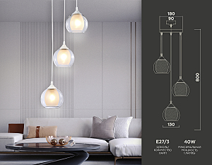 Допускается отличие страны-изготовителя, указанной в характеристиках. Линии производства могут находиться в нескольких государствах. Это не влияет на качество изготовления товара: все заводы данного бренда работают по общим стандартам, а готовые изделия проходят соответствующий контроль.Россия Коллекция Traditional ЦветЦвет арматуры Белый Цвет Белый Материал арматуры Металл Цвет плафона прозрачный, белый матовый Материал плафона Стекло РазмерыВысота (мм) 800 Диаметр (мм) 281 Ширина (мм) 281 ЭлектрикаКоличество ламп (шт) 3 Цоколь E27 Мощность лампы (Вт) 40 Напряжение (В) 220 Площадь освещения 10 Дополнительная информацияСпособ крепления Планка Степень защиты (IP) IP20 Тип подвеса На тросах Количество подвесов Много подвесных элементов -