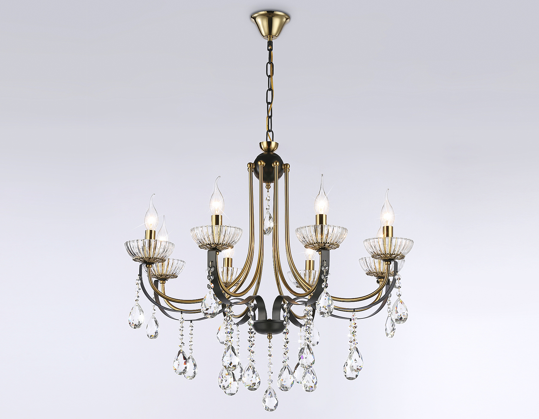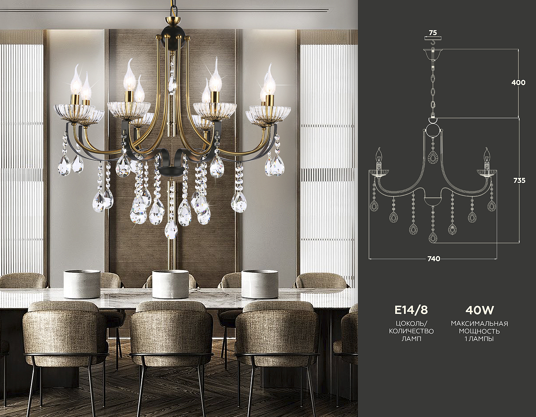 Допускается отличие страны-изготовителя, указанной в характеристиках. Линии производства могут находиться в нескольких государствах. Это не влияет на качество изготовления товара: все заводы данного бренда работают по общим стандартам, а готовые изделия проходят соответствующий контроль.Россия Коллекция Traditional ЦветЦвет арматуры Золото, Черный Цвет Золото Материал арматуры Металл Цвет декора прозрачный Материал декора Хрусталь РазмерыВысота (мм) 1135 Диаметр (мм) 740 Высота минимальная (мм) 735 Ширина (мм) 740 ЭлектрикаКоличество ламп (шт) 8 Цоколь E14 Мощность лампы (Вт) 40 Напряжение (В) 220 Площадь освещения 23 Дополнительная информацияСпособ крепления Крюк Степень защиты (IP) IP20 Тип подвеса На цепи -