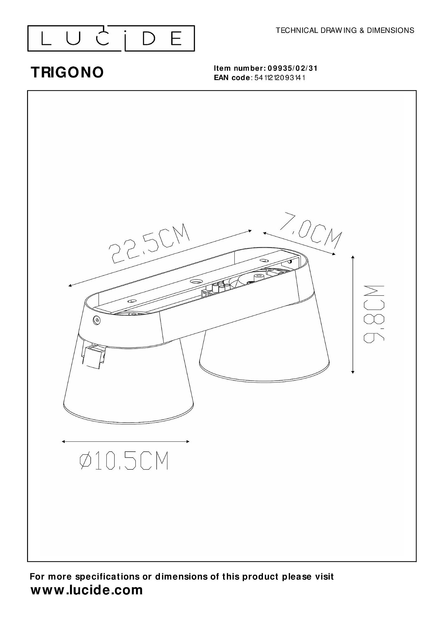 Допускается отличие страны-изготовителя, указанной в характеристиках. Линии производства могут находиться в нескольких государствах. Это не влияет на качество изготовления товара: все заводы данного бренда работают по общим стандартам, а готовые изделия проходят соответствующий контроль.Бельгия Коллекция Trigono ЦветЦвет арматуры Белый Цвет Белый Материал арматуры Металл Цвет плафона Белый Материал плафона Металл РазмерыВысота (мм) 98 Длина (мм) 225 Высота минимальная (мм) 98 Ширина (мм) 105 Диаметр абажура-плафона 8-10,5 Высота абажура-плафона 70 ЭлектрикаКоличество ламп (шт) 2 Цоколь GU10 Лампочки в комплекте Нет в комплекте Мощность лампы (Вт) 50 Дополнительная информацияСтепень защиты (IP) IP20 Вес (Кг) 0,78 Диммирование Да -