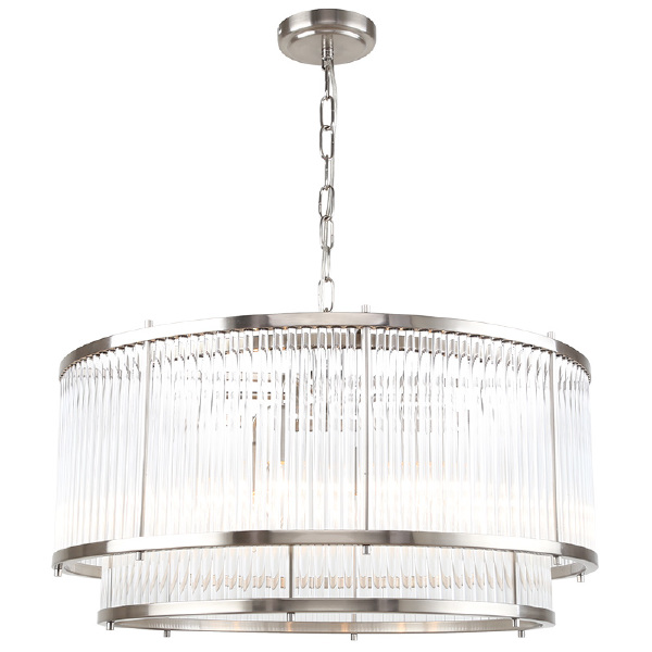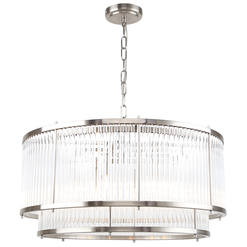 Люстра подвесная из коллекции Two-one выполнена из металла, гальванизированного в цвет никеля, и декорирована стеклянными трубочками. Каркас люстры отделан металлическими кантами и дополнительно закрепленными металлическими стержнями, гальванизированными в цвет арматуры. Премиальное качество и неповторимыи? дизаи?н светильников идеально подои?дут как в классические, так и современные интерьеры.