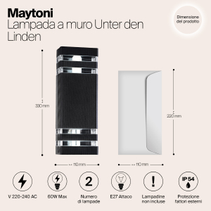 Допускается отличие страны-изготовителя, указанной в характеристиках. Линии производства могут находиться в нескольких государствах. Это не влияет на качество изготовления товара: все заводы данного бренда работают по общим стандартам, а готовые изделия проходят соответствующий контроль.Германия Коллекция Unter den Linden ЦветЦвет арматуры Черный Цвет Черный Материал арматуры Металл РазмерыВысота (мм) 330 Ширина (мм) 110 Глубина (мм) 100 ЭлектрикаКоличество ламп (шт) 2 Цоколь E27 Мощность лампы (Вт) 60 Напряжение (В) 220 Дополнительная информацияСтепень защиты (IP) IP54 Вес (Кг) 0,98 -