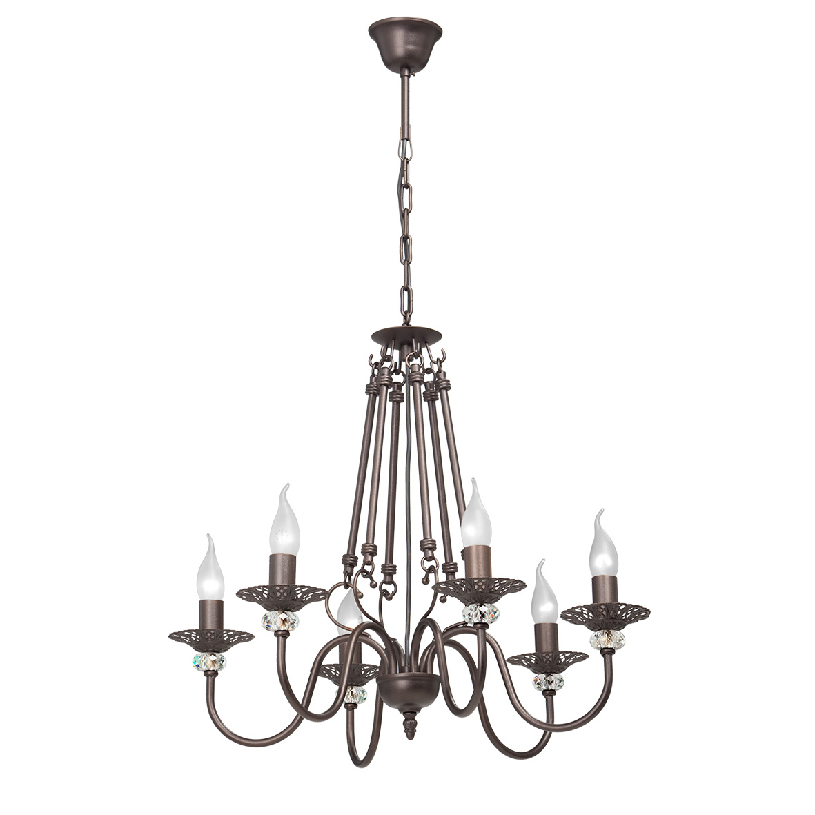 Допускается отличие страны-изготовителя, указанной в характеристиках. Линии производства могут находиться в нескольких государствах. Это не влияет на качество изготовления товара: все заводы данного бренда работают по общим стандартам, а готовые изделия проходят соответствующий контроль.Россия Коллекция V1784 ЦветЦвет арматуры Коричневый Цвет Коричневый Материал арматуры Металл Материал декора Металл РазмерыВысота (мм) 900 Диаметр (мм) 600 Ширина (мм) 600 ЭлектрикаКоличество ламп (шт) 6 Цоколь E14 Мощность лампы (Вт) 60 Напряжение (В) 220 Дополнительная информацияСпособ крепления Крюк Вес (Кг) 2,7 Тип подвеса На цепи -
