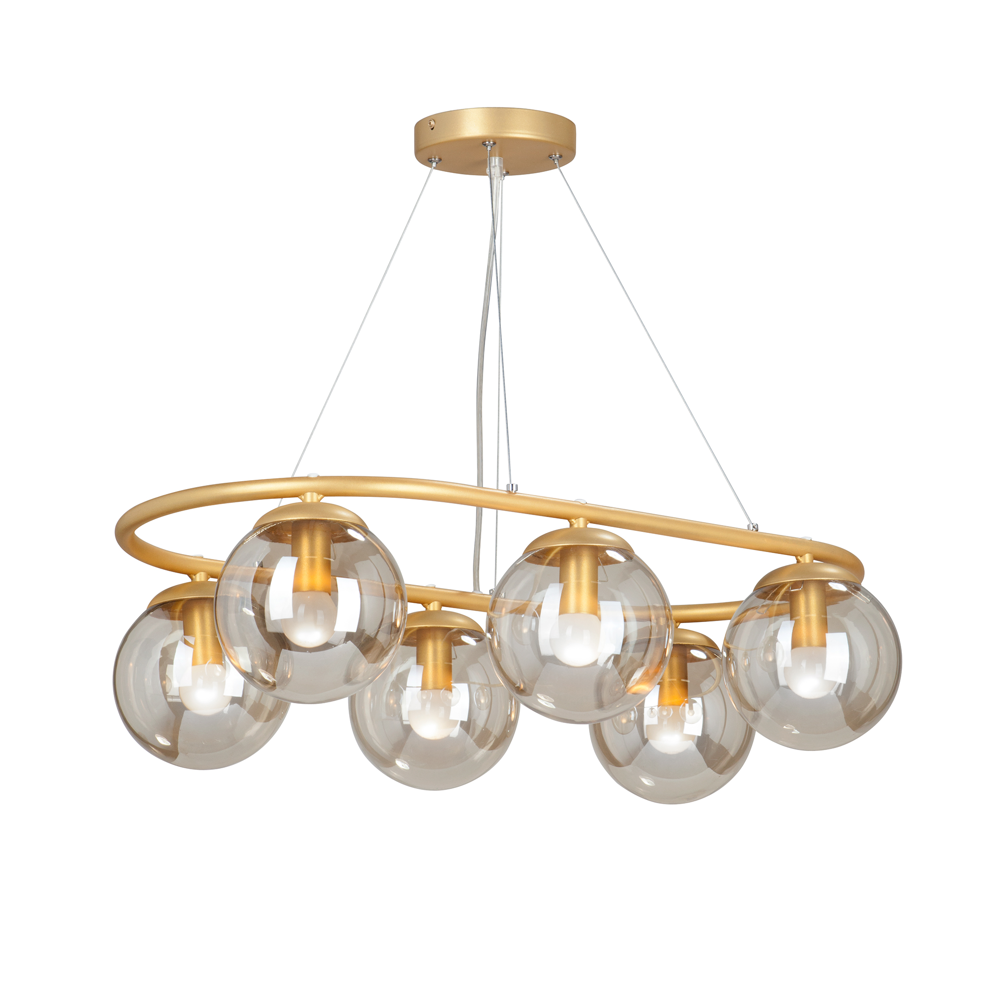 Допускается отличие страны-изготовителя, указанной в характеристиках. Линии производства могут находиться в нескольких государствах. Это не влияет на качество изготовления товара: все заводы данного бренда работают по общим стандартам, а готовые изделия проходят соответствующий контроль.Россия Коллекция V4935 ЦветЦвет арматуры Золото Цвет Золото Материал арматуры Металл Цвет плафона коньячный Материал декора Металл Материал плафона Стекло РазмерыВысота (мм) 1040 Длина (мм) 730 Диаметр (мм) 485 Ширина (мм) 485 ЭлектрикаКоличество ламп (шт) 6 Цоколь E14 Тип лампы Накаливания Лампочки в комплекте Нет в комплекте Мощность лампы (Вт) 40 Общая мощность (Вт) 240 Площадь освещения 12 Дополнительная информацияСпособ крепления Планка Вес (Кг) 3 Тип подвеса На тросах -