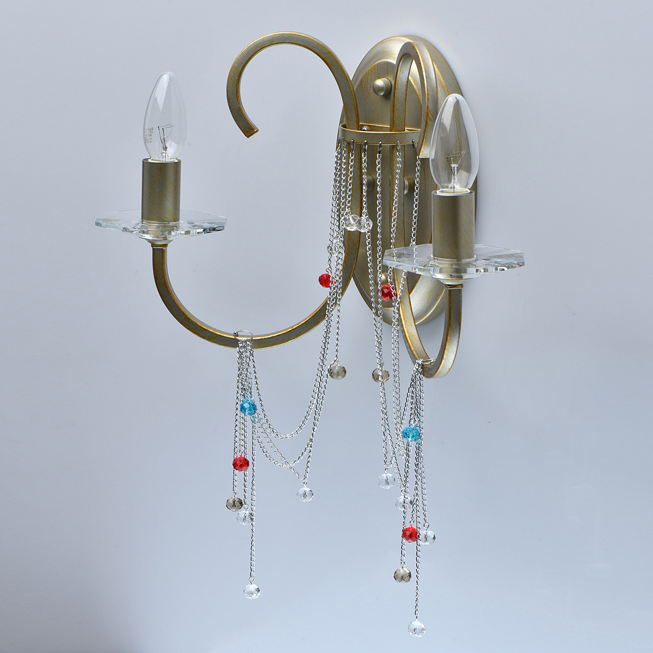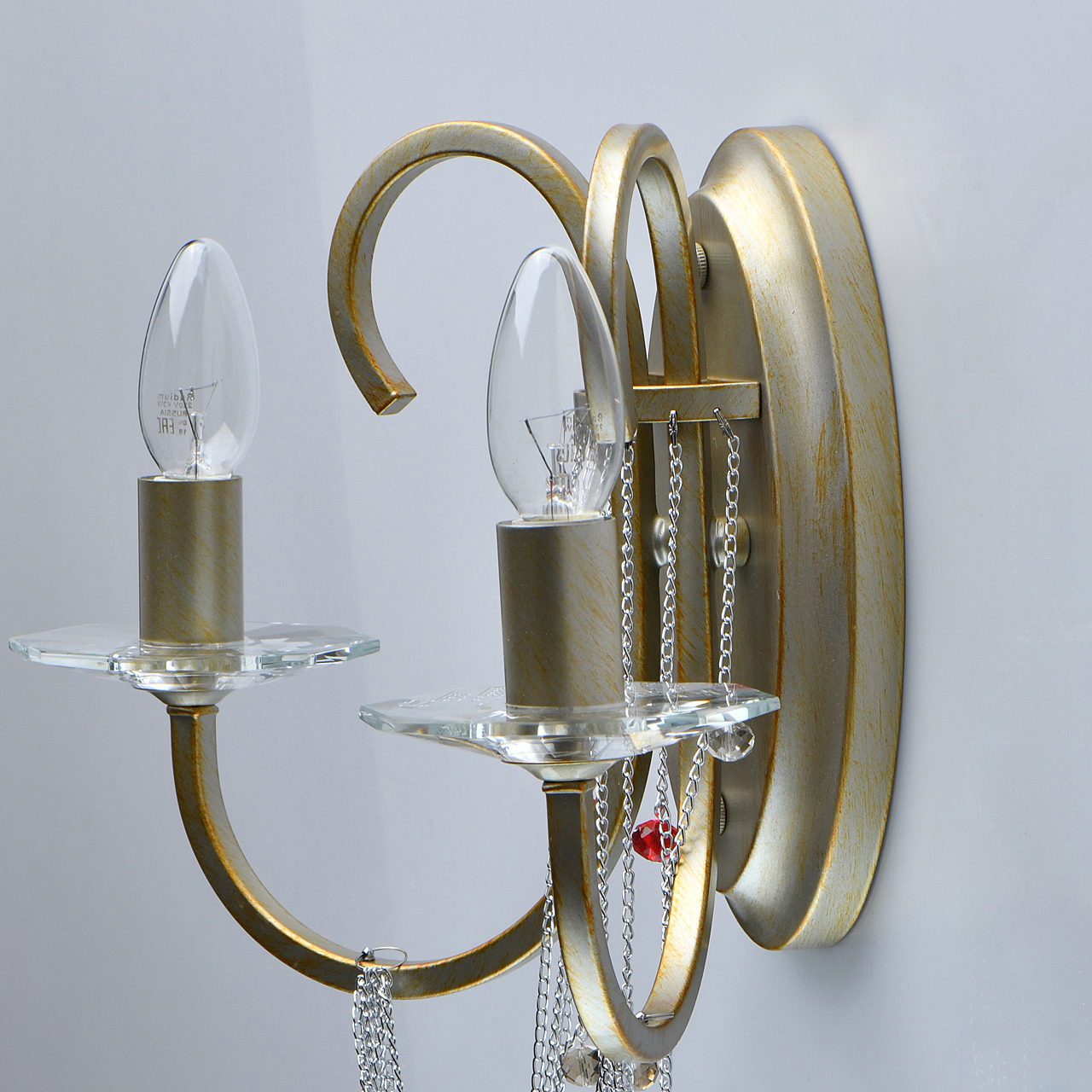 Допускается отличие страны-изготовителя, указанной в характеристиках. Линии производства могут находиться в нескольких государствах. Это не влияет на качество изготовления товара: все заводы данного бренда работают по общим стандартам, а готовые изделия проходят соответствующий контроль.Германия Коллекция Валенсия ЦветЦвет арматуры античное перламутровое серебро Цвет Латунь Материал арматуры Металл Цвет декора прозрачный, красный, шампань, синий Материал декора Хрусталь РазмерыВысота (мм) 200 Длина (мм) 400 Диаметр (мм) 47 Ширина (мм) 400 ЭлектрикаКоличество ламп (шт) 2 Цоколь E14 Мощность лампы (Вт) 60 Напряжение (В) 220 Площадь освещения 6 Дополнительная информацияСтепень защиты (IP) IP20 Вес (Кг) 1.4 -
