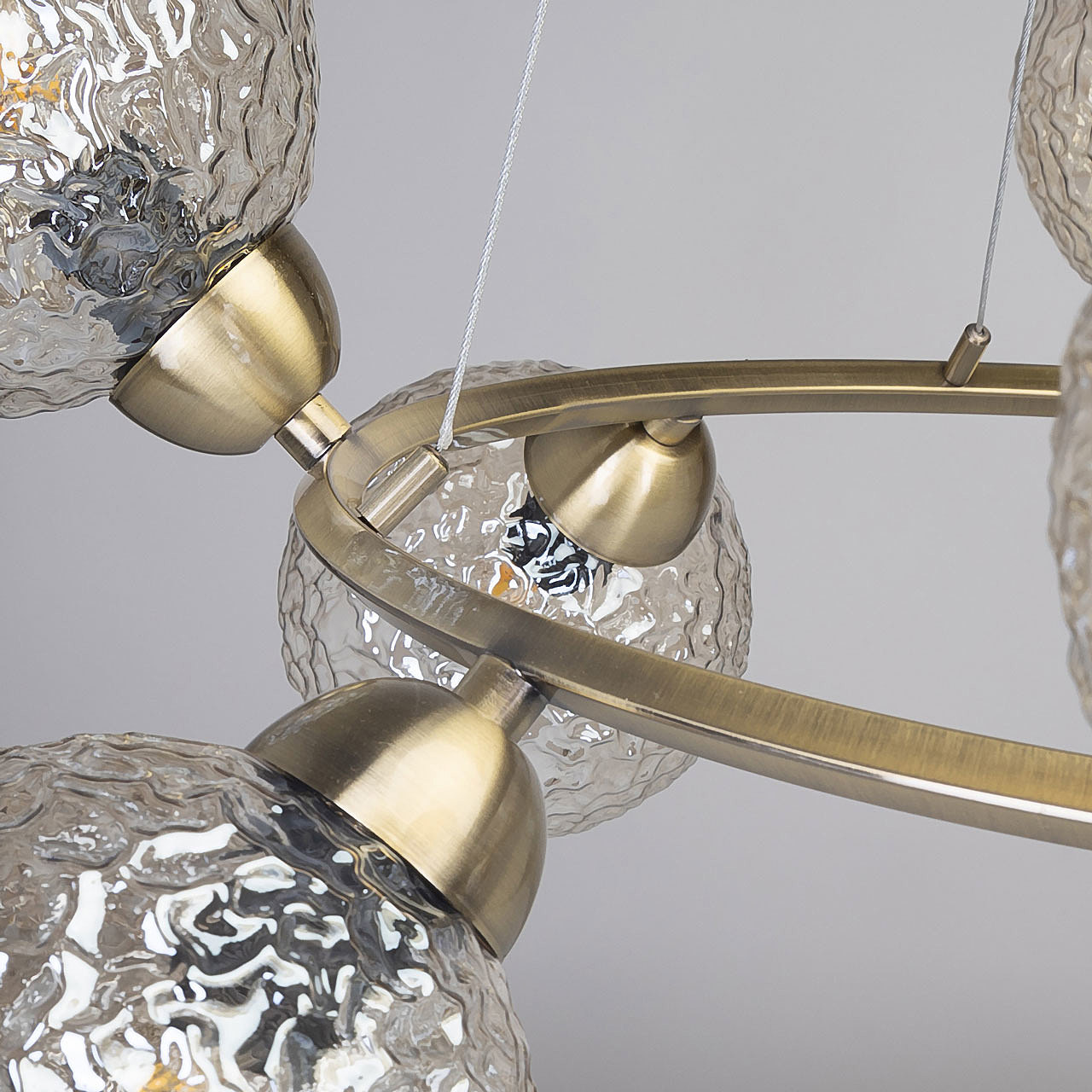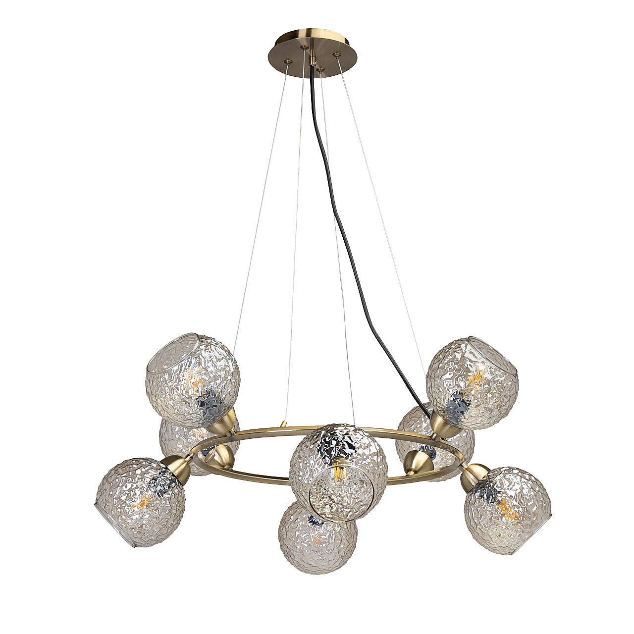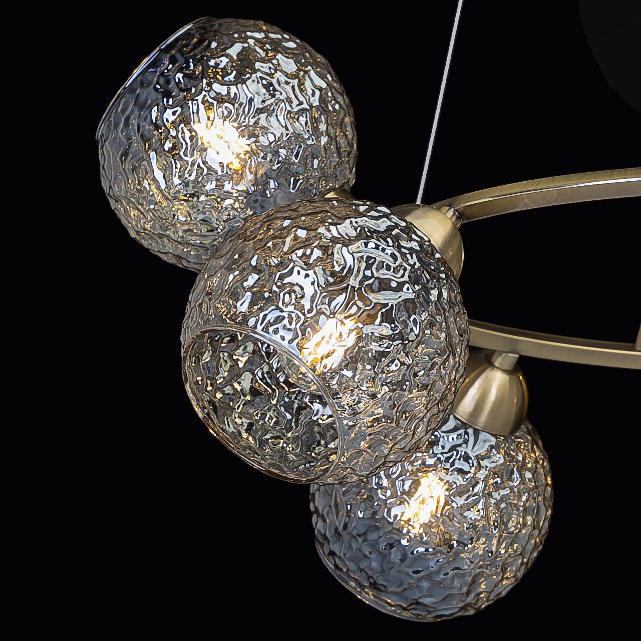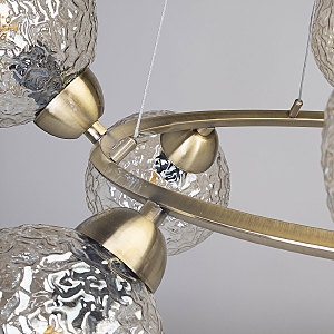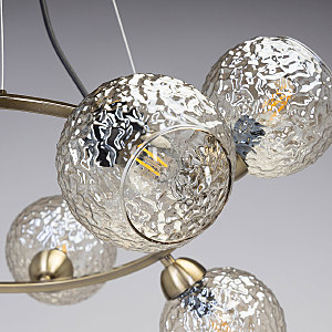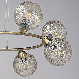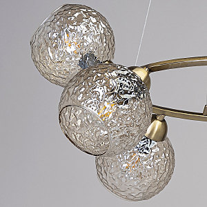 Подвесной светильник в современном дизайне хорошо подойдет в гостиную, спальню, кухню. Модный цвет античной бронзы сохраняет свою актуальность. Декор из стеклянных фактурных плафонов обеспечивает комфортное освещение. Фактура стеклянных плафонов в сочетании с цветом шампань создает красивый свет. Направленность плафонов в вверх и вниз позволяет хорошо осветить всю площадь комнаты. Подвесы в виде тросов позволяют устанавливать комфортную высоту. Заменяемые источники света удобны в эксплуатации.