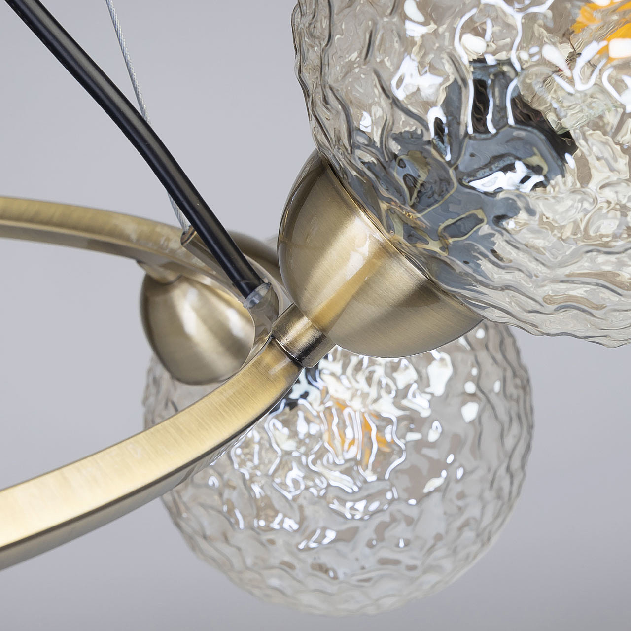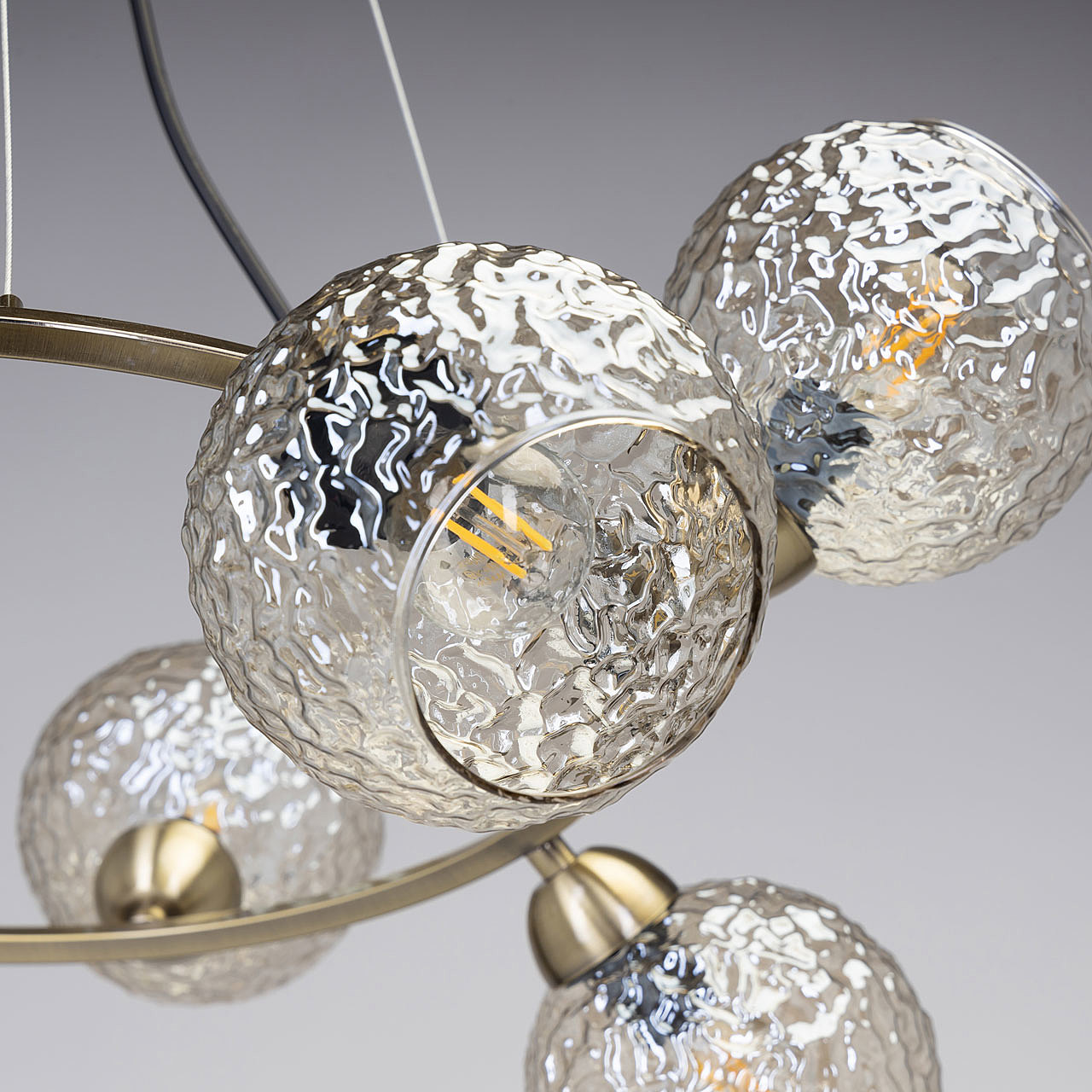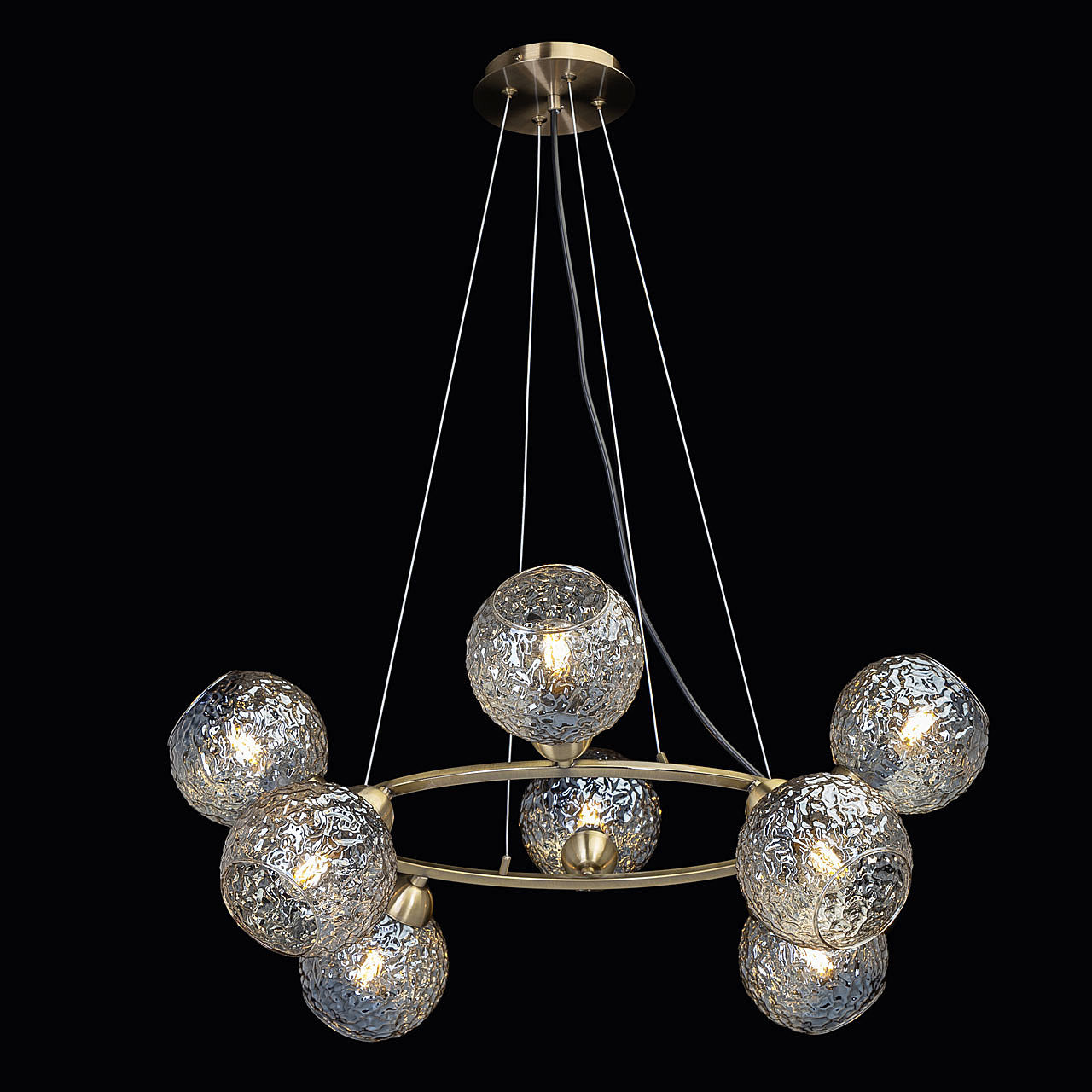 Подвесной светильник в современном дизайне хорошо подойдет в гостиную, спальню, кухню. Модный цвет античной бронзы сохраняет свою актуальность. Декор из стеклянных фактурных плафонов обеспечивает комфортное освещение. Фактура стеклянных плафонов в сочетании с цветом шампань создает красивый свет. Направленность плафонов в вверх и вниз позволяет хорошо осветить всю площадь комнаты. Подвесы в виде тросов позволяют устанавливать комфортную высоту. Заменяемые источники света удобны в эксплуатации.