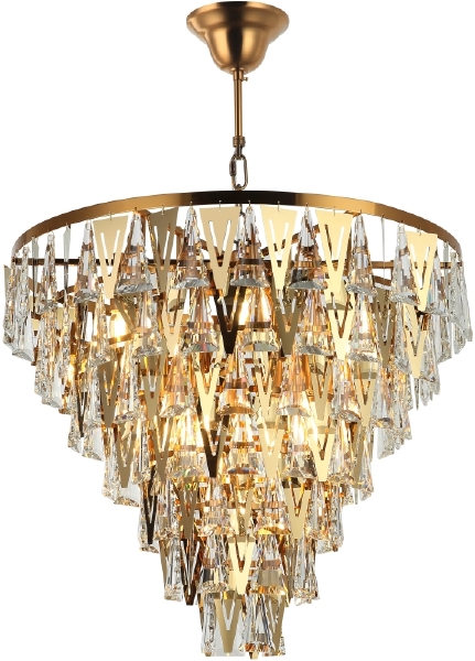Люстра подвесная из коллекции Vaviani вполнена из металла, гальванизированного в цвет бронзы, и декорирована прозрачным хрусталем высшей категории треугольной формы и тонкими треугольниками из нержавеющей стали, отполированной до зеркального блеска и гальванизированной в цвет арматуры. Люстра коллекции выглядит стильно и респектабельно. Премиальное качество и неповторимыи? дизаи?н светильников идеально подои?дут как в классические, так и современные дизайнерские интерьеры.