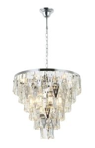 Люстра подвесная из коллекции Vaviani выполнена из металла, гальванизированного в цвет хрома, и декорирована прозрачным хрусталем высшей категории треугольной формы и тонкими треугольниками из нержавеющей стали, отполированной до зеркального блеска и гальванизированной в цвет арматуры. Люстра коллекции выглядит стильно и респектабельно. Премиальное качество и неповторимыи? дизаи?н светильников идеально подои?дут как в классические, так и современные дизайнерские интерьеры.