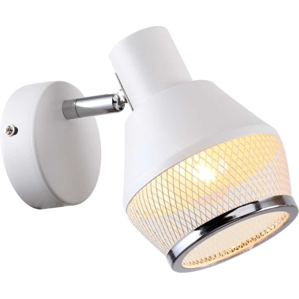 Спот настенный из коллекции Vekta выполнен из металла, окрашенного в белый цвет. Держатель плафона гальванизирован в цвет хрома. Металлический плафон спота декорирован сеткой, окрашенной в белый цвет, и кантом, гальванизированным в цвет хрома. Плафон имеет поворотный механизм.