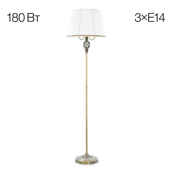 Допускается отличие страны-изготовителя, указанной в характеристиках. Линии производства могут находиться в нескольких государствах. Это не влияет на качество изготовления товара: все заводы данного бренда работают по общим стандартам, а готовые изделия проходят соответствующий контроль.Дания Коллекция Вена ЦветЦвет арматуры Бронза Цвет Белый Материал арматуры Металл Цвет плафона Белый Материал плафона Текстиль РазмерыВысота (мм) 1640 Диаметр (мм) 420 Ширина (мм) 420 ЭлектрикаКоличество ламп (шт) 3 Цоколь Е14 Тип лампы Накаливания, Светодиодные, Компактные люмин. Мощность лампы (Вт) 60 Общая мощность (Вт) 180 Световой поток 1000 Площадь освещения 5 Дополнительная информацияСтепень защиты (IP) IP20 Тип выключателя Ножной выключатель -