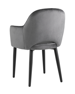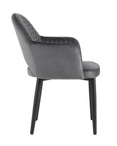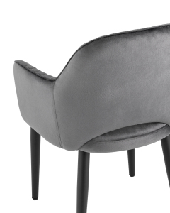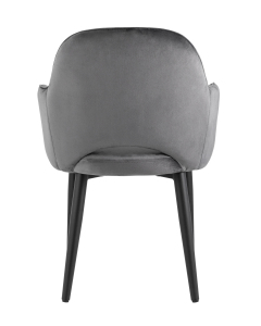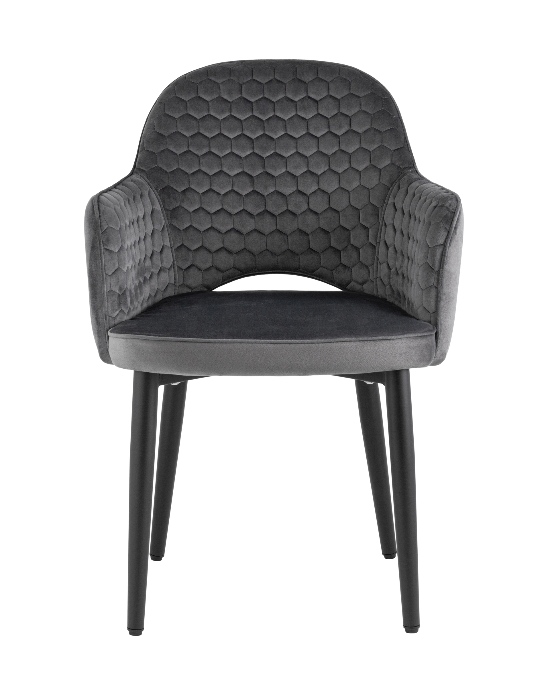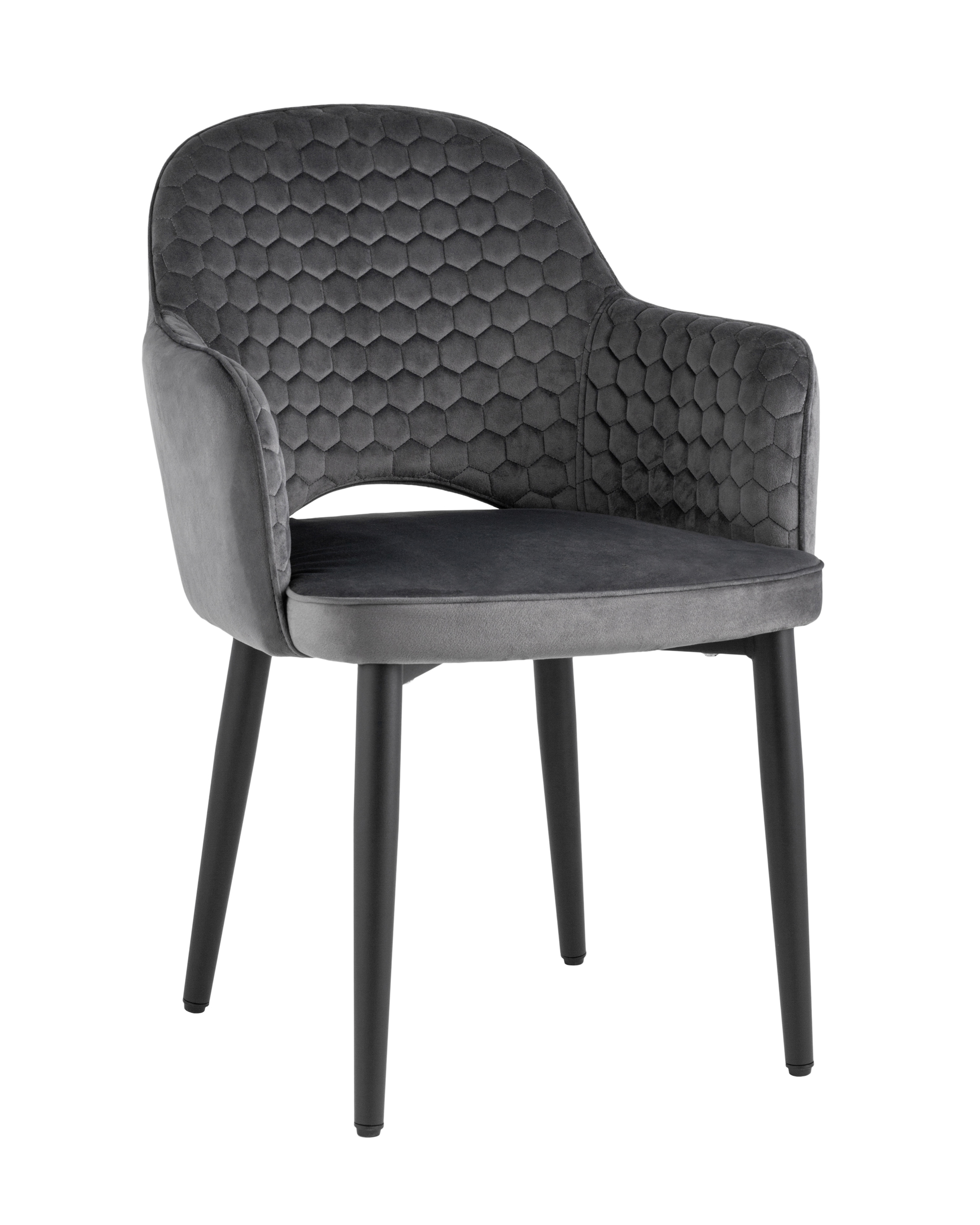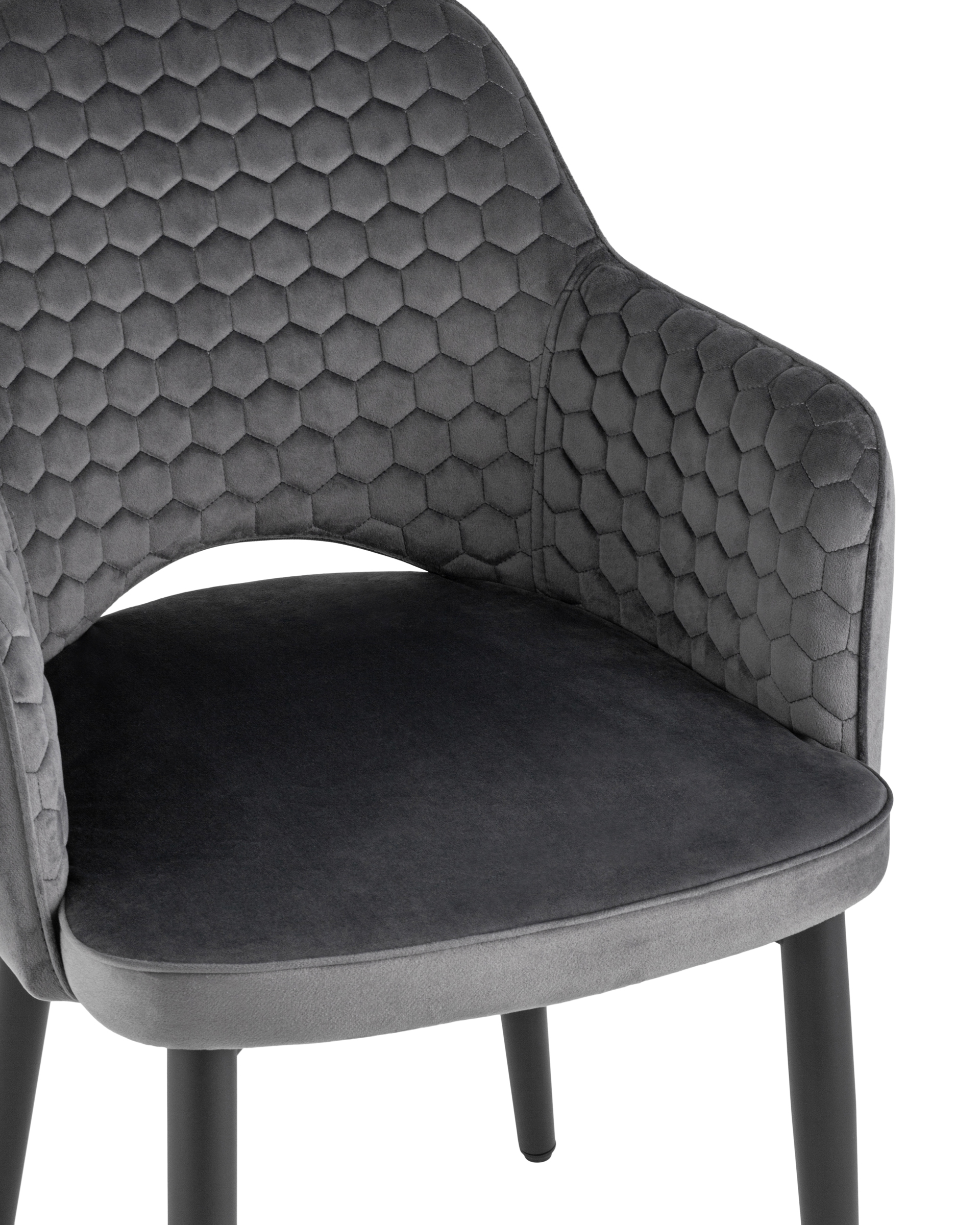 <p>Мягкий стул с округлой спинкой анатомической формы и удобными подлокотниками подарит комфорт и уют. В качестве обивки используется велюр - прочный износостойкий материал. Внутренняя сторона спинки и подлокотников украшена декором в виде сот.</p><p>Прямые металлические черные ножки имеют нестандартную форму в виде перевернутого конуса, поэтому обеспечивают хорошую устойчивость и делают стул оригинальным. Специальные подпятники на ножках защищают напольное покрытие от повреждений и предотвращают скольжение.</p><p>Изделие будет прекрасно смотреться как отдельный предмет мебели, так и в комплекте с обеденным столом.</p>