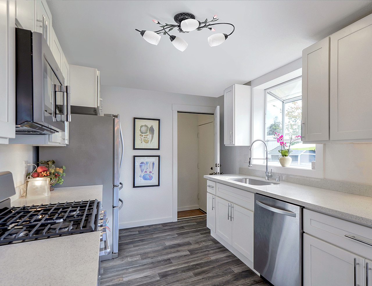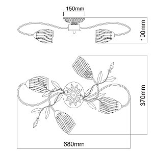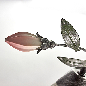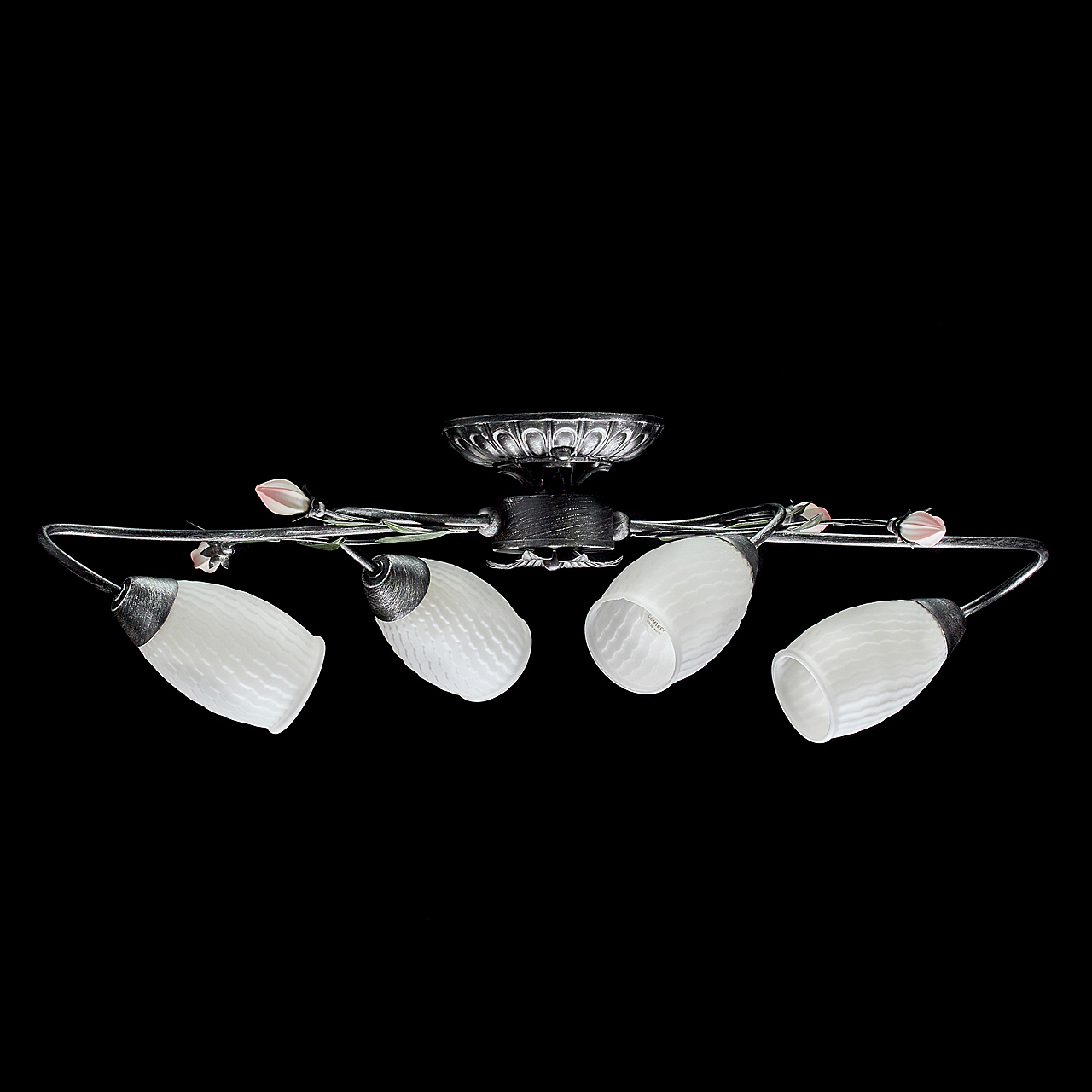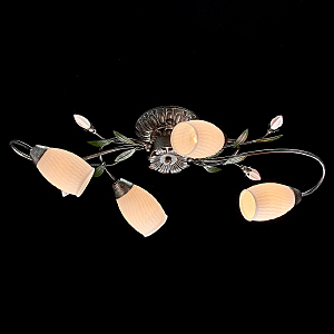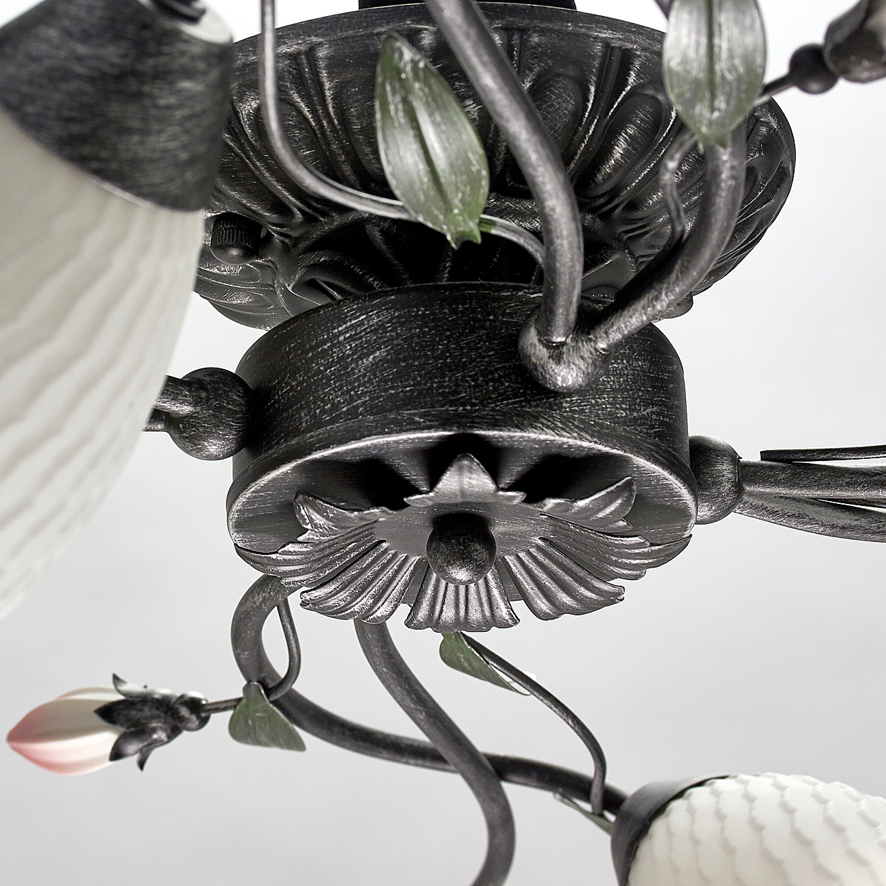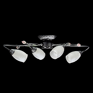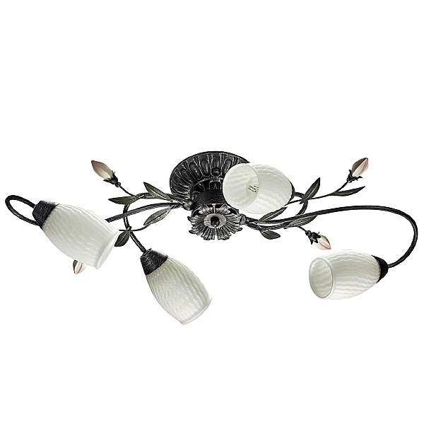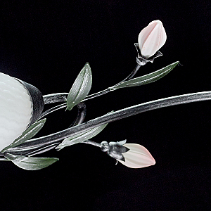 Основание светильника выполнено из металла и обработано по технологии хай-лайт, где основной цвет черный и декоративный слой серебряного цвета. Плафоны из стекла отлиты в сложную форму и окрашены изнутри в белый цвет. Декоративные элементы в виде листьев окрашены в зеленый цвет. Декор в виде бутонов выполнен из фарфора и окрашен в розовый цвет.