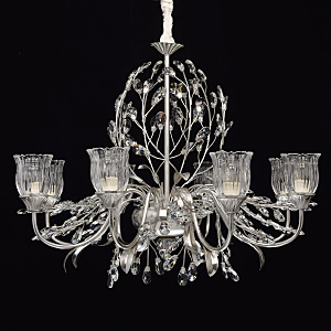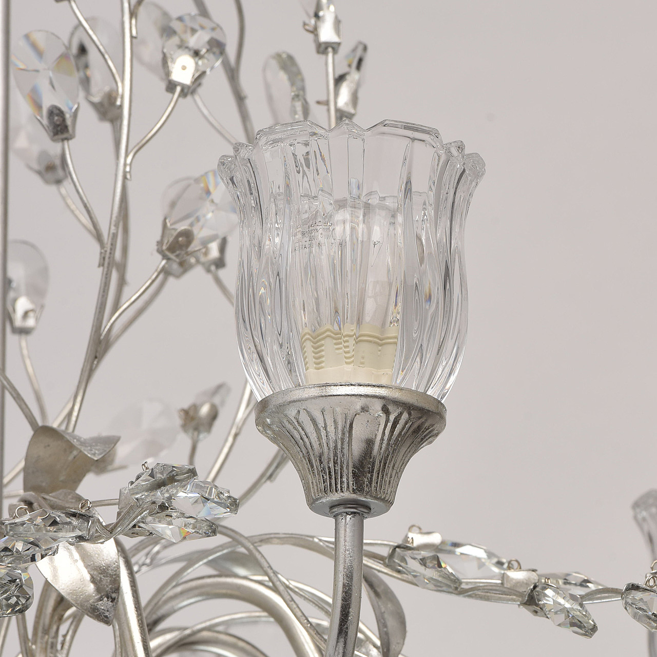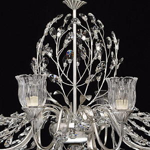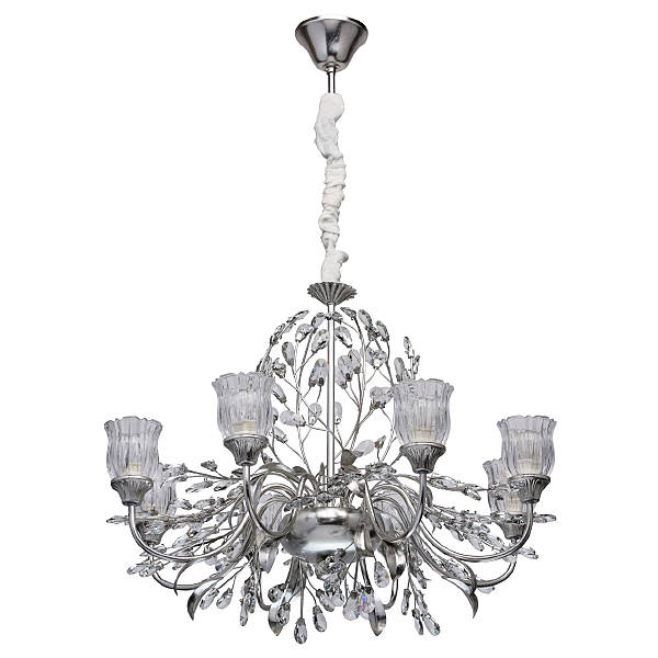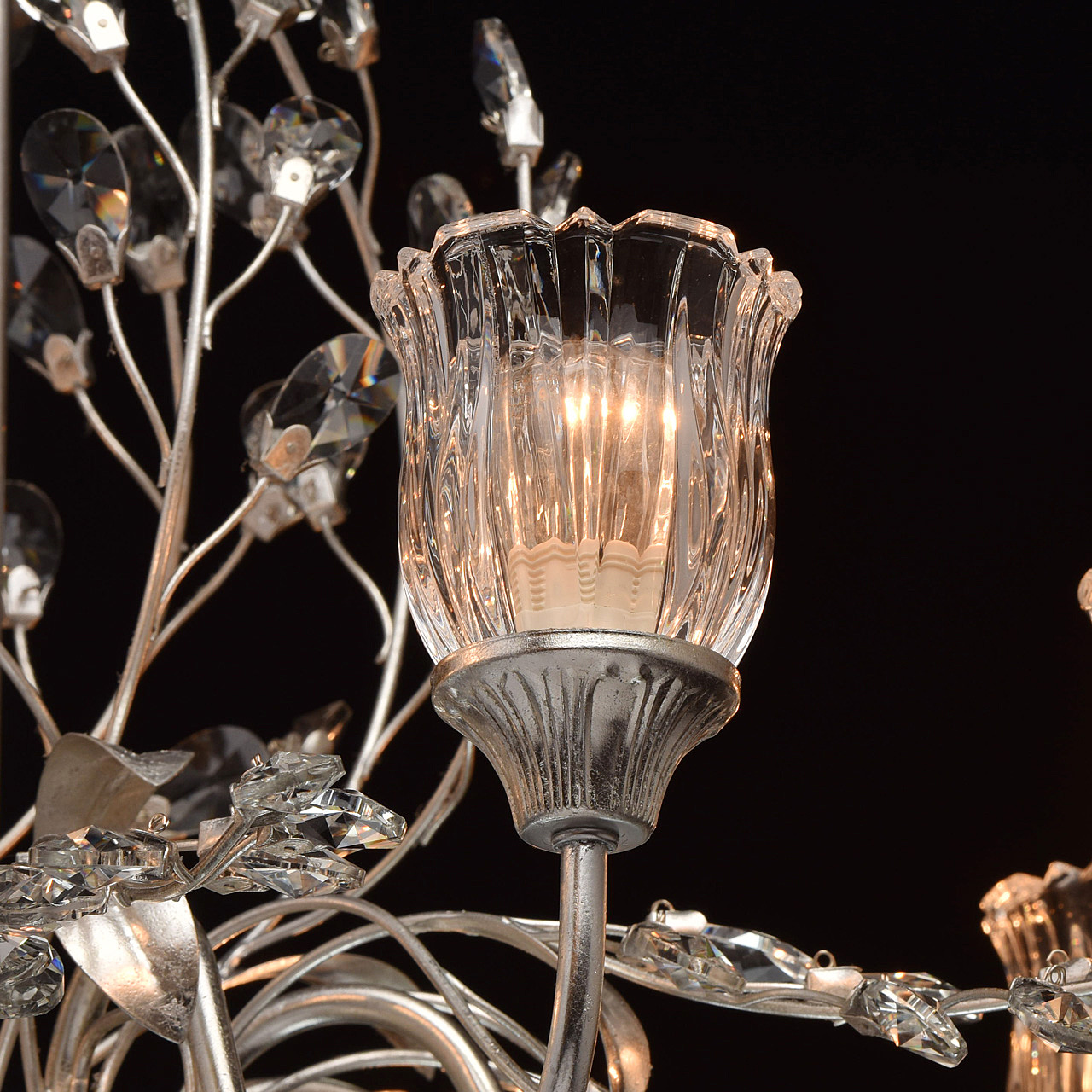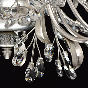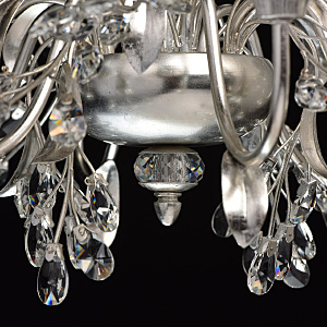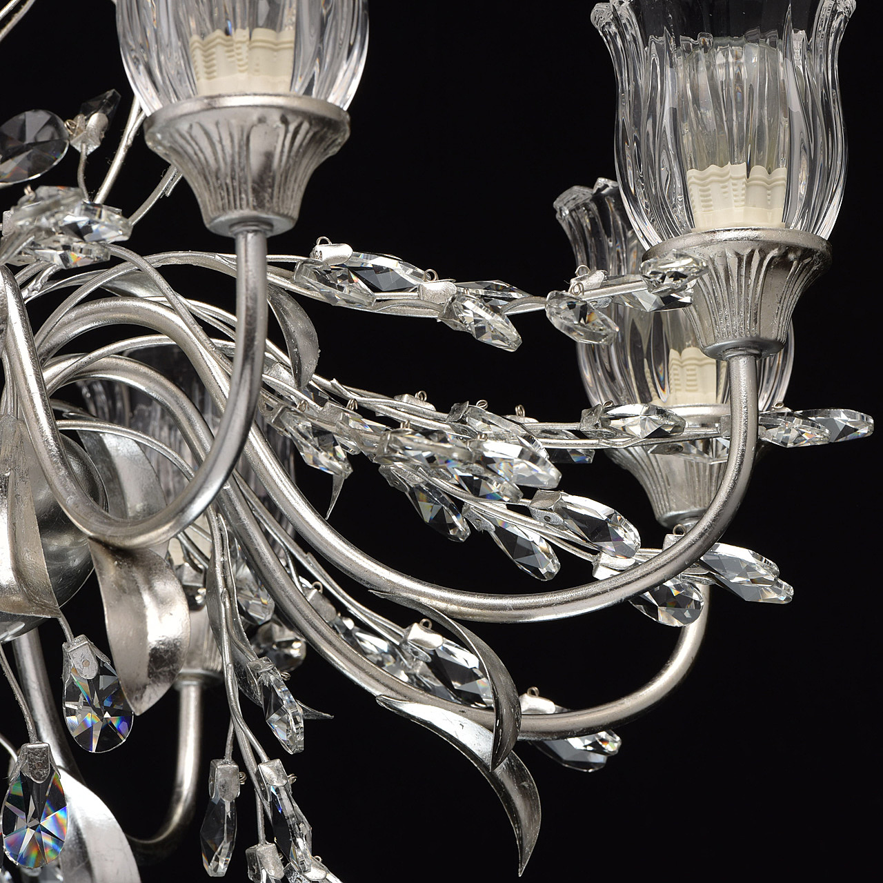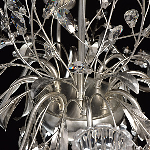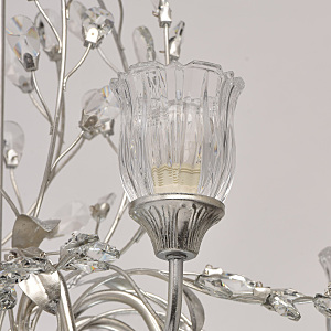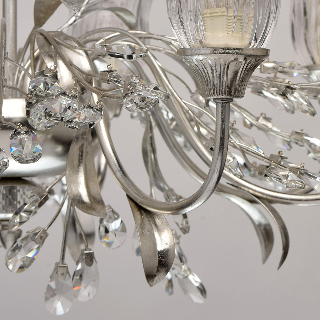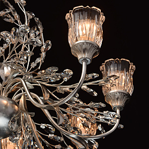 "Лёгкий флористический дизайн люстры из коллекции ""Виола"" наполнит обстановку романтичной и, вместе с тем, величественной красотой. Металлическое основание, покрытое сусальным серебром, выгодно подчеркнуто плавным изгибом рожка. Под стать им - стеклянные плафоны в виде грациозных бутонов. Но по-настоящему роскошной люстру делает богатый растительный декор: хрустальные капли переплетаются между собой, напоминая тонкие изящные лепестки.