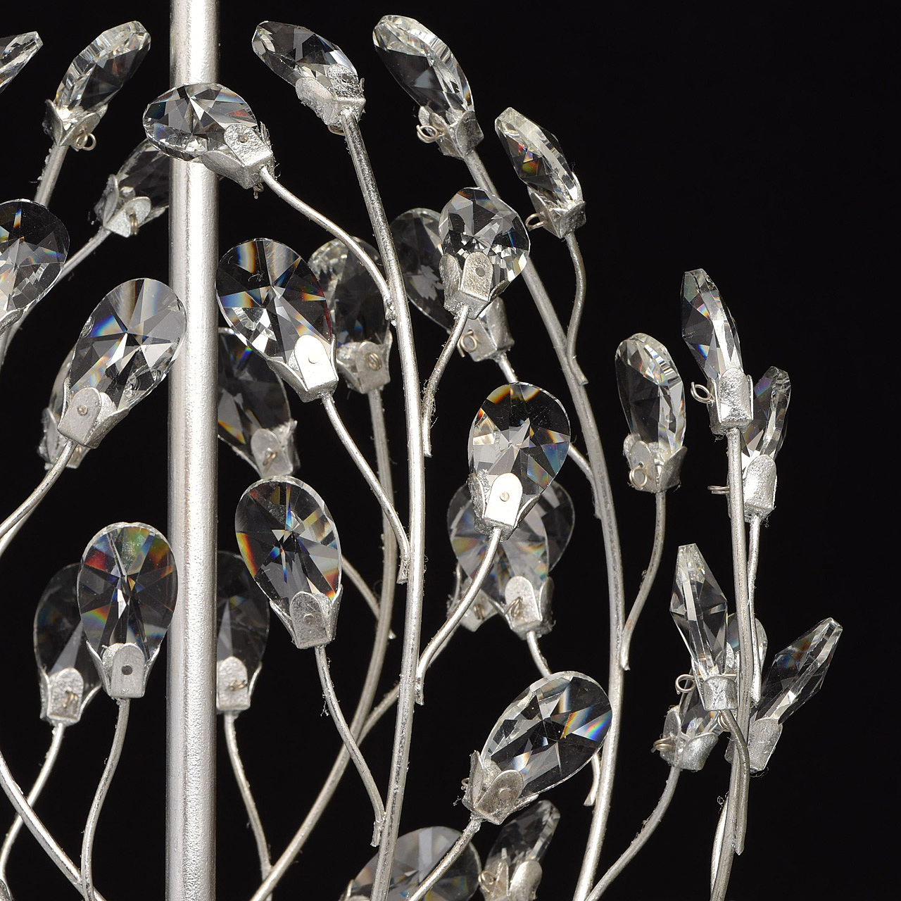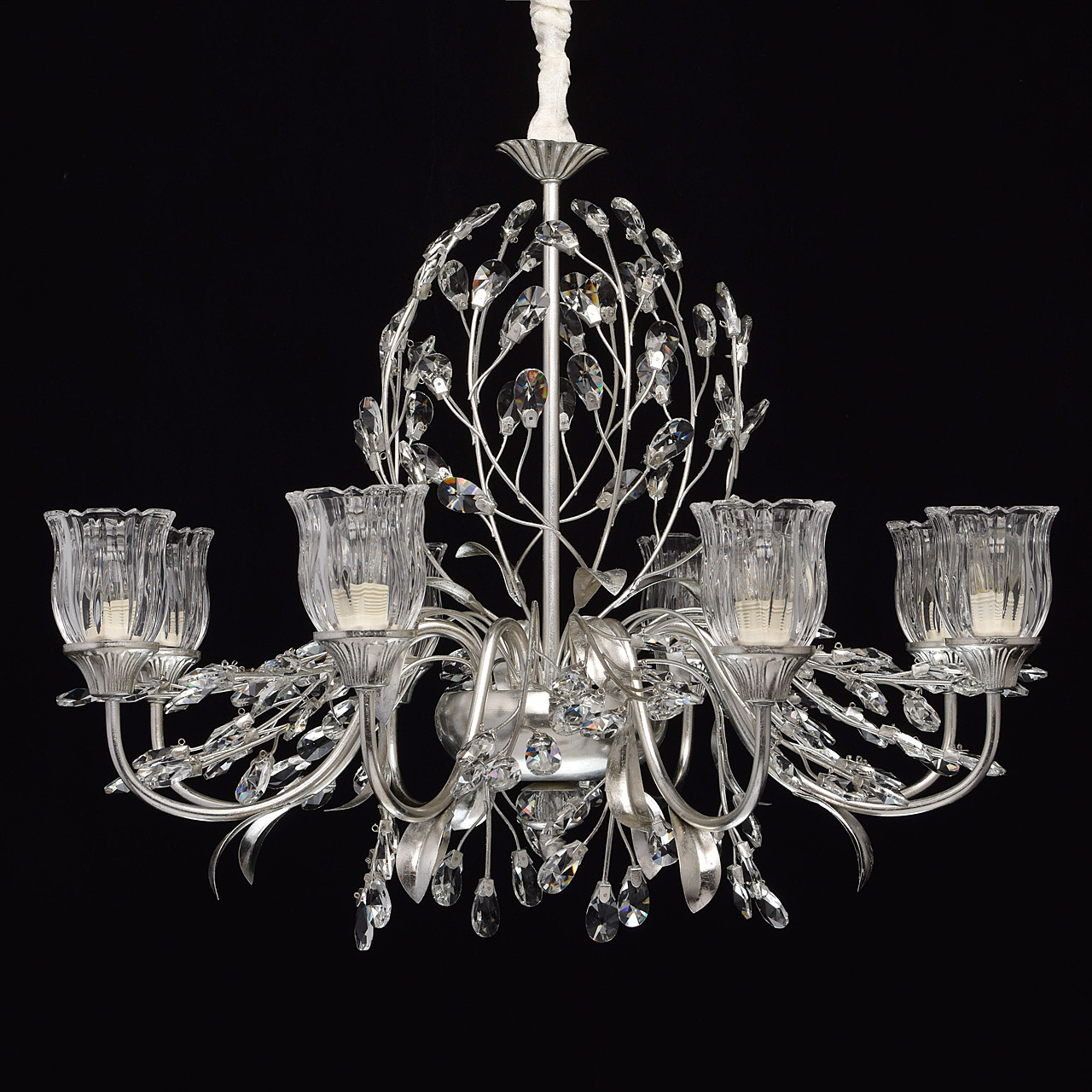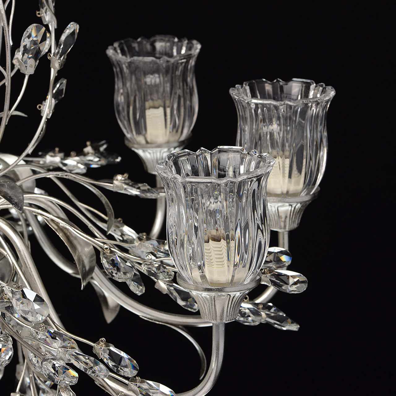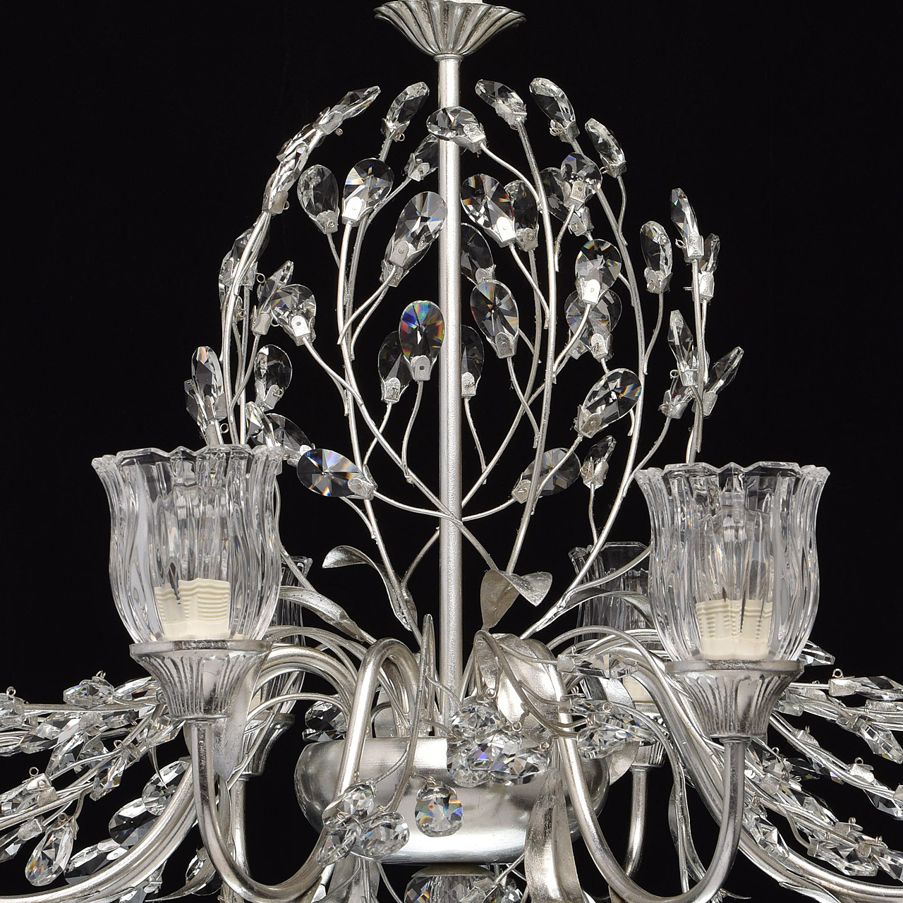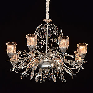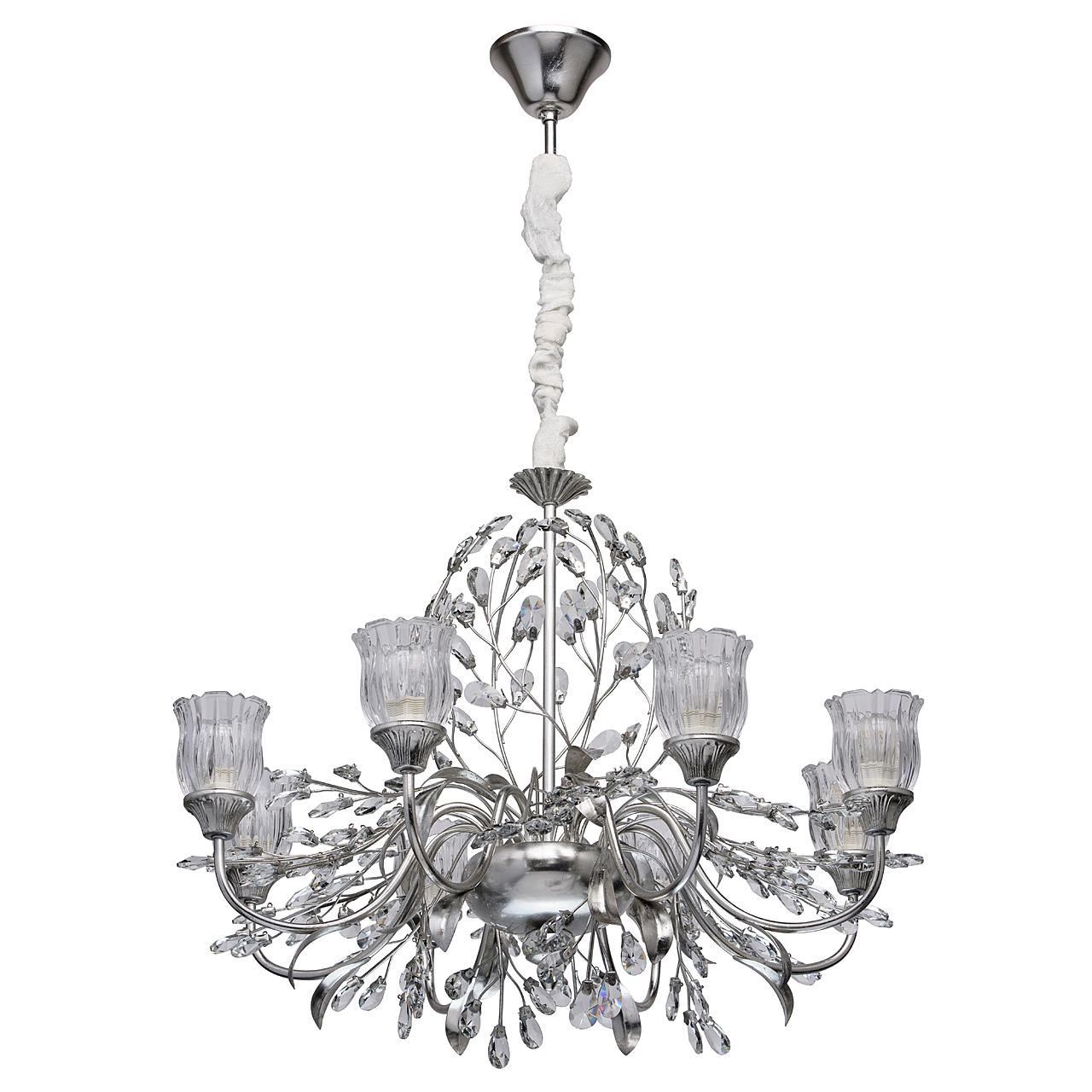 "Лёгкий флористический дизайн люстры из коллекции ""Виола"" наполнит обстановку романтичной и, вместе с тем, величественной красотой. Металлическое основание, покрытое сусальным серебром, выгодно подчеркнуто плавным изгибом рожка. Под стать им - стеклянные плафоны в виде грациозных бутонов. Но по-настоящему роскошной люстру делает богатый растительный декор: хрустальные капли переплетаются между собой, напоминая тонкие изящные лепестки.