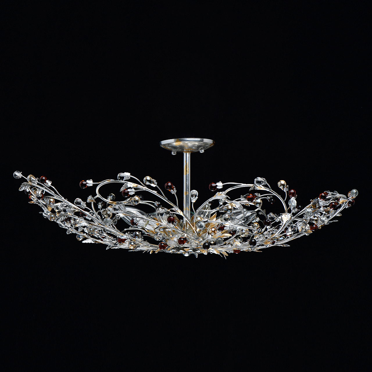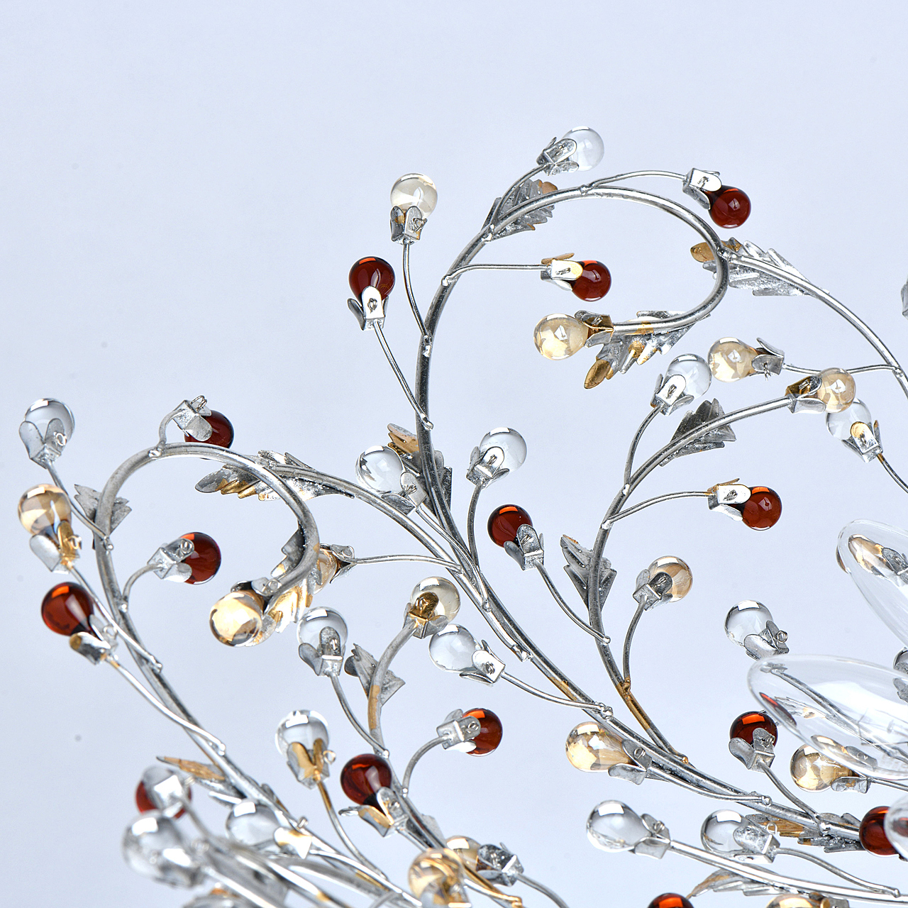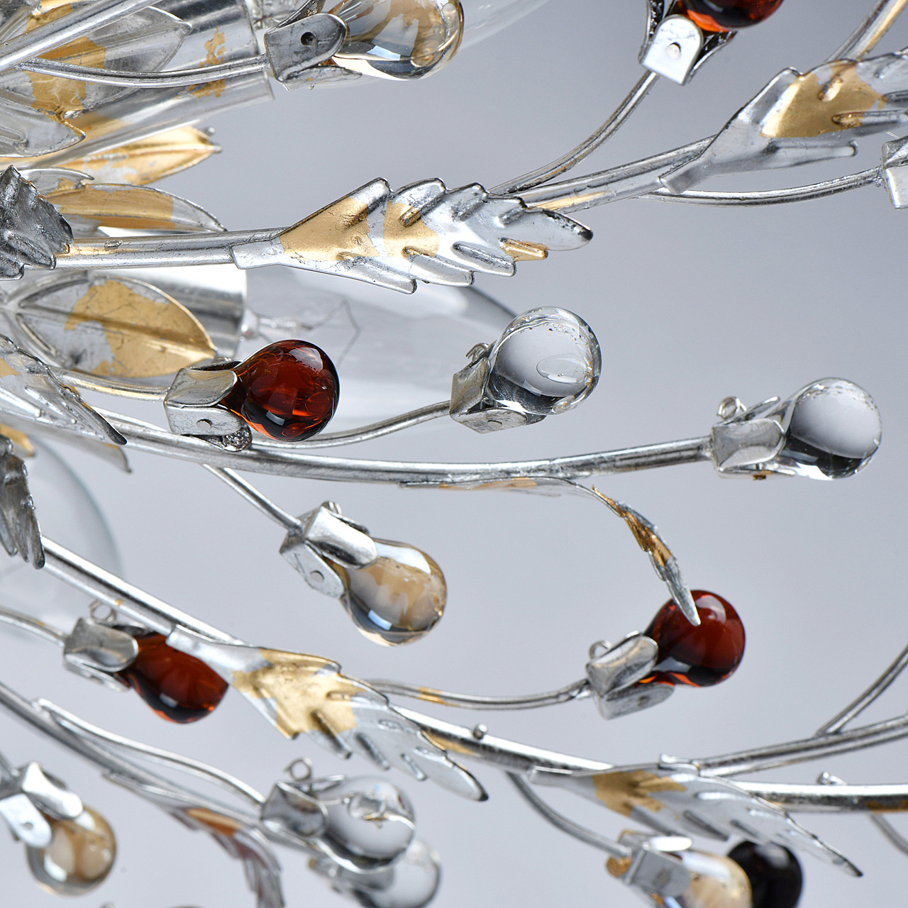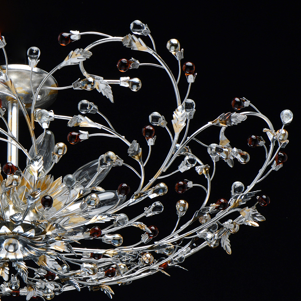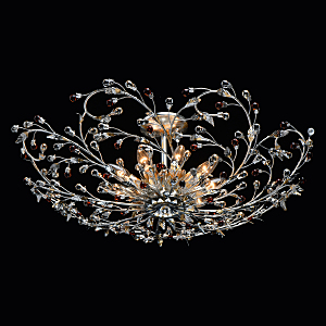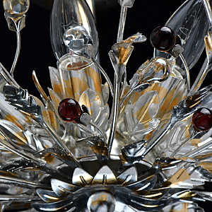 Флористический декор из цветного хрусталя миниатюрен.Покрытие сусальным золотом и серебром ручной работы.Большой диаметр светильника обеспечивает высокие параметры освещенности.Компактная высота актуальна для стандартной высоты потолка.Широкая семья включает бра, потолочные светильники на 6 и 9 рожков и подвесов на 6 и 9 рожков.