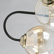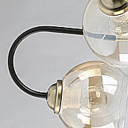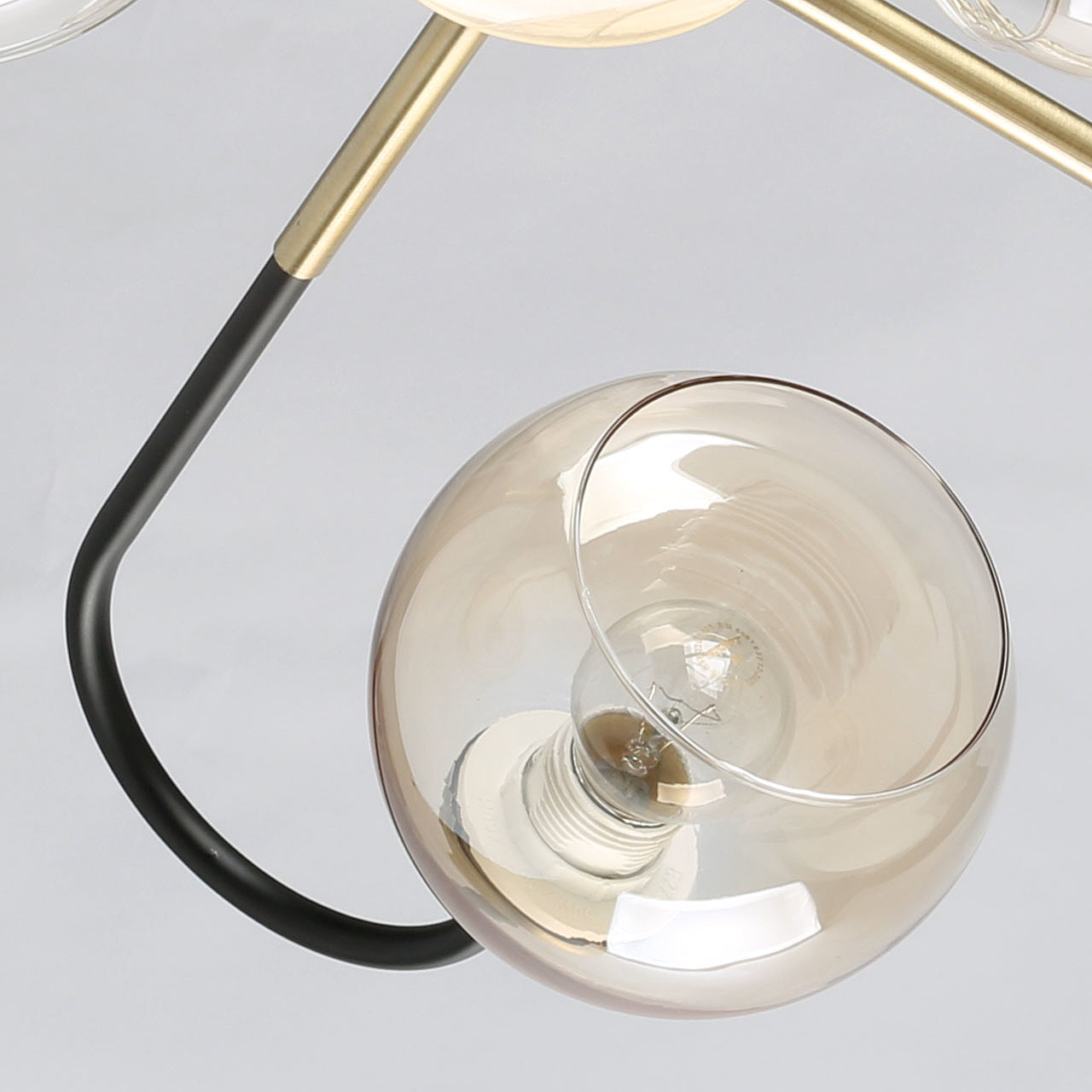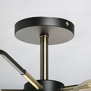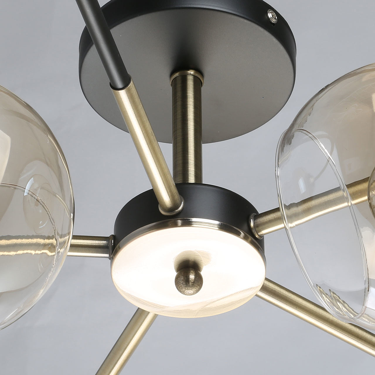 Оригинальный дизайн светильника придает стиль интерьеруКонтрастное сочетание черного и цвета бронзы эффектно смотрится на потолке.Стеклянные плафоны цвета шампань создают комфортное освещение. Разнонаправленные плафоны позволяют хорошо осветить пространство комнаты.