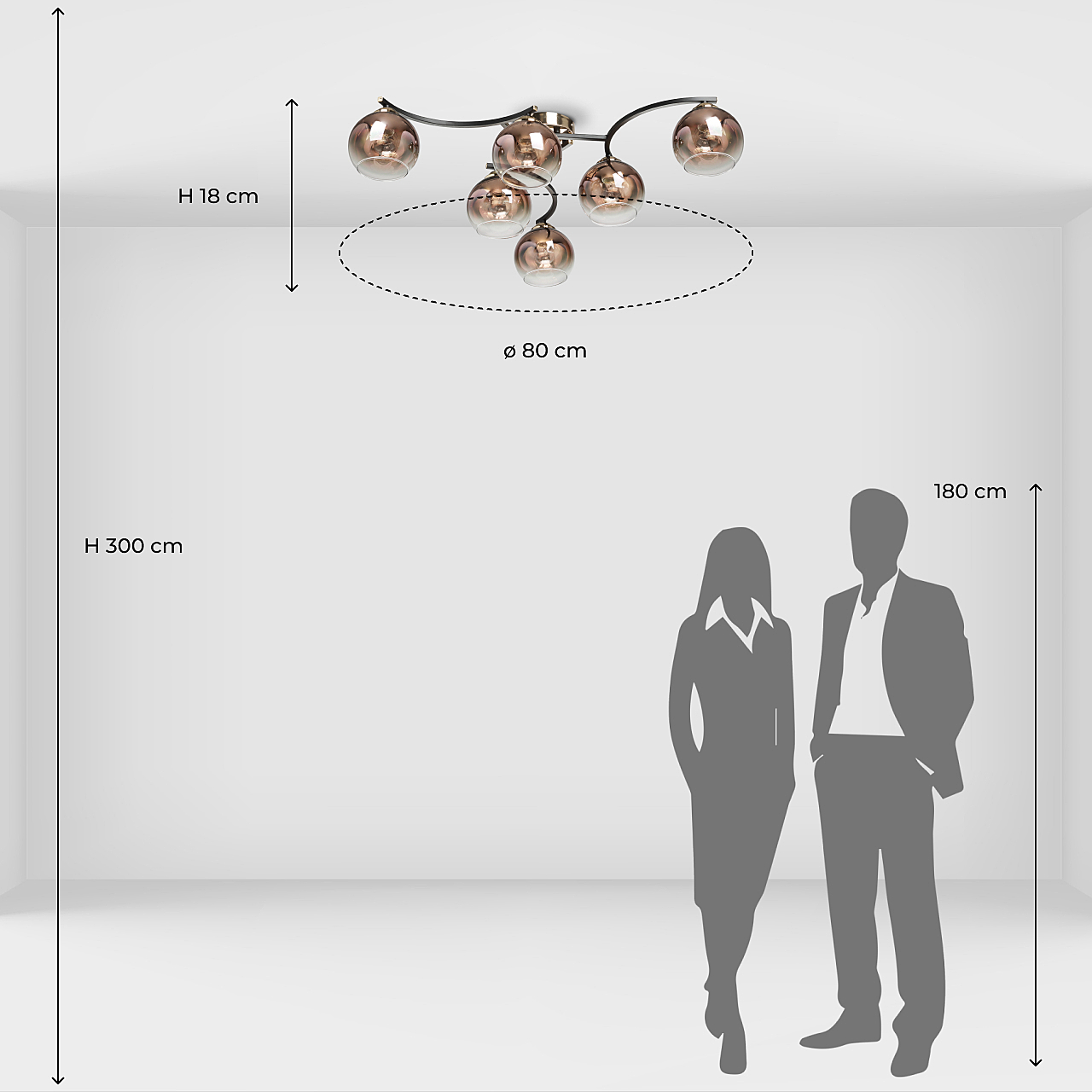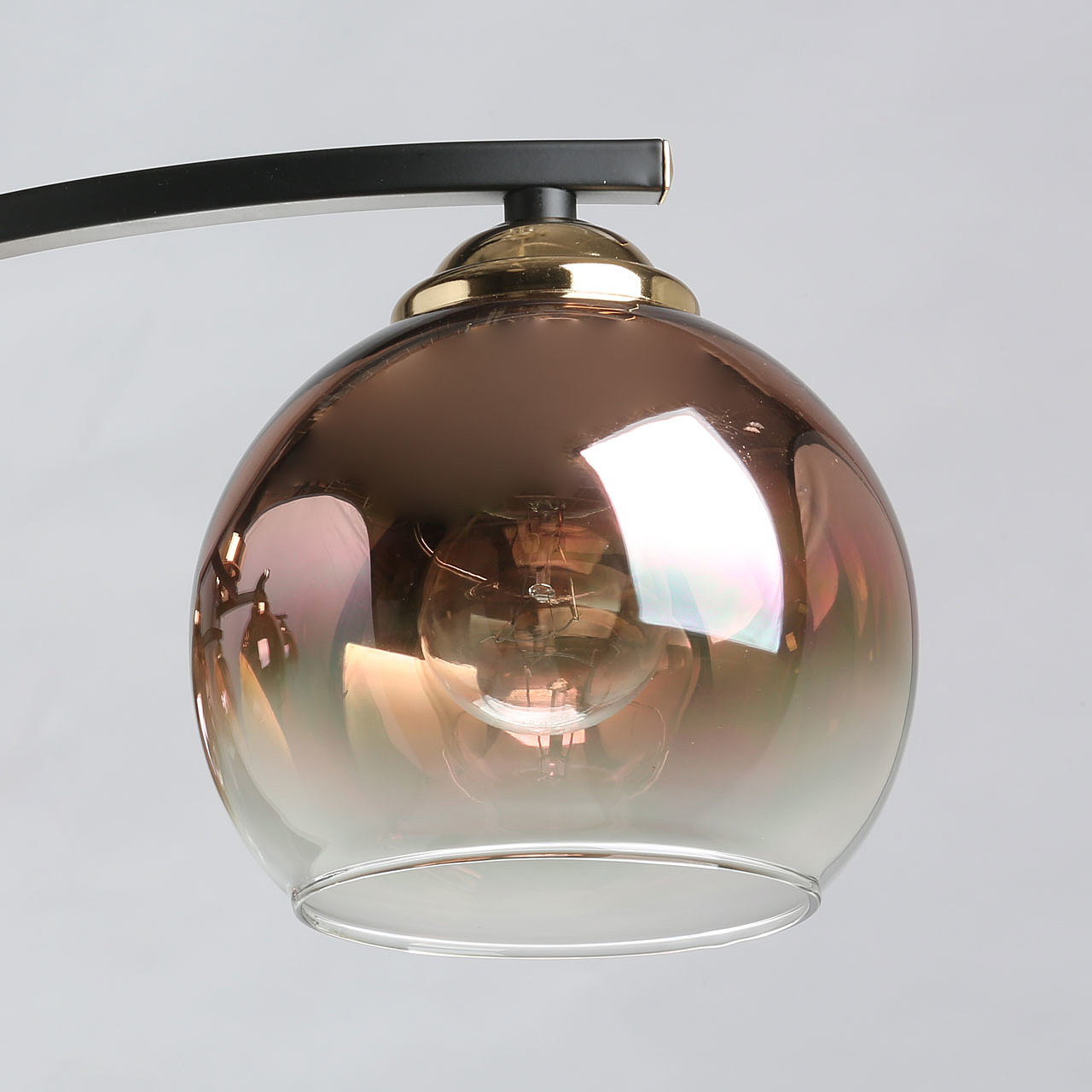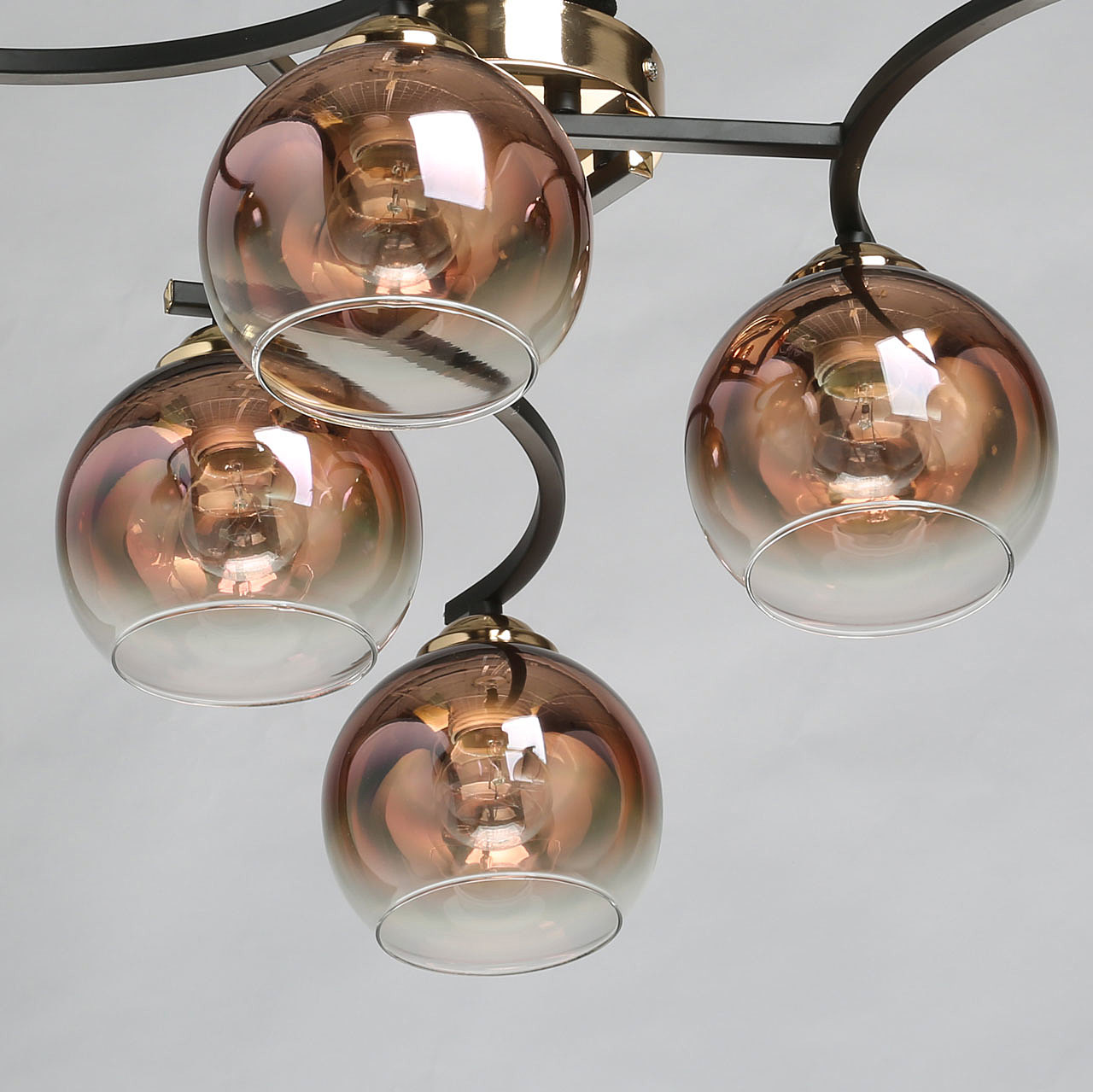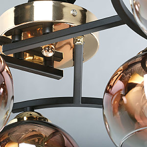 Потолочная люстра идеально подходит к стандартным потолкамСочетание черного и цвета бронзы эффектно выделяет люстру на потолкеСтеклянные плафоны вниз медного цвета создают комфортное освещение. Модный цвет меди плафонов и градиентное его нанесение привлекают к себе внимание, создают акцент на потолочной люстре.