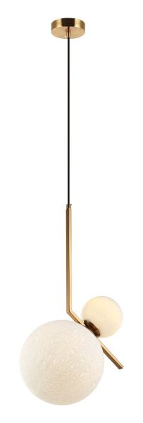 Светильник подвесной из коллекции Zaira выполнен из металла, гальванизированного в цвет бронзы, и декорирован двумя плафонами из фактурного белого матового стекла разного диаметра. Плафоны устанавливаются за счет винтовой резьбы. Благодаря хорошей центровке плафонов светильник висит строго вертикально. Премиальное качество и неповторимыи? дизаи?н светильников идеально подои?дут в современные дизайнерские интерьеры.