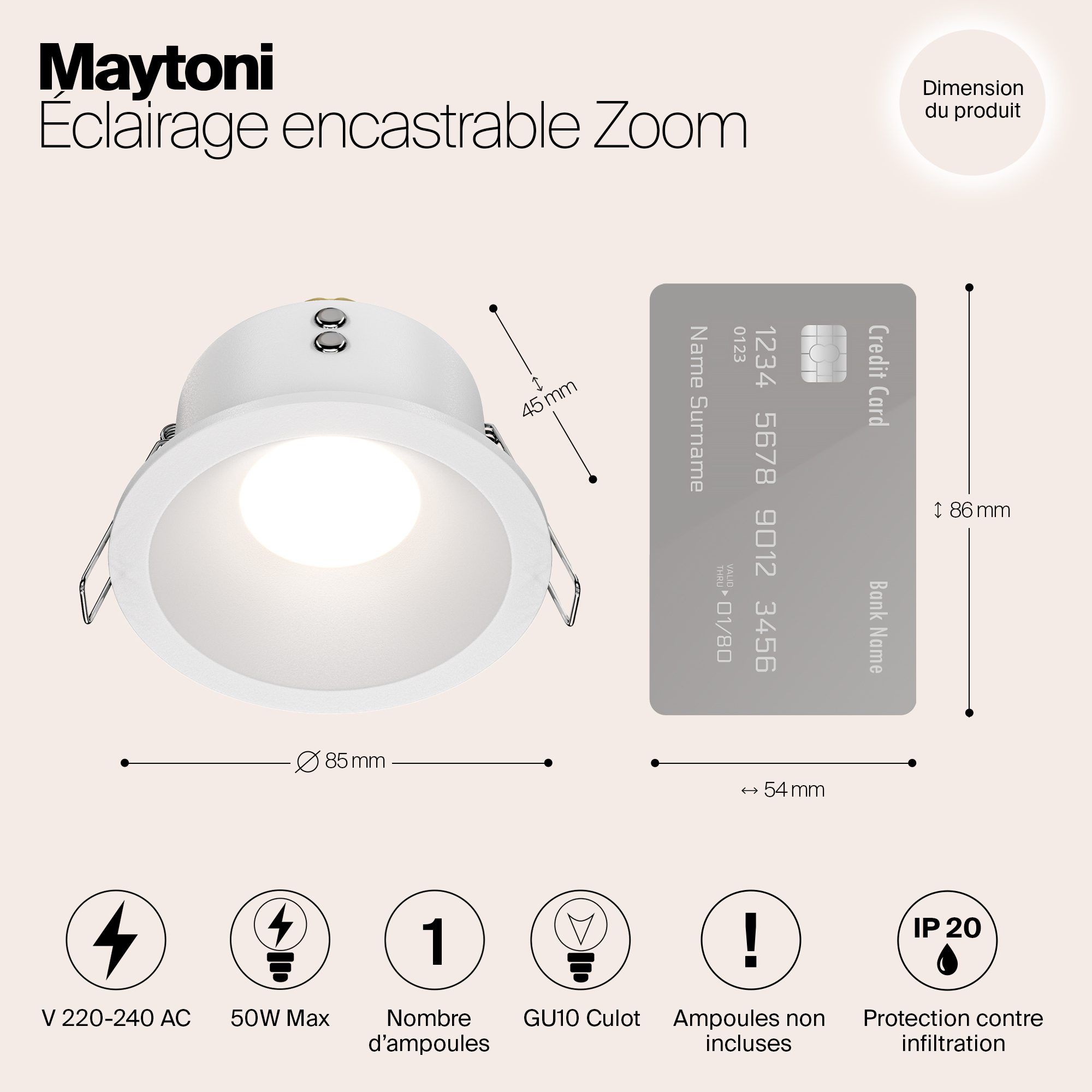 Допускается отличие страны-изготовителя, указанной в характеристиках. Линии производства могут находиться в нескольких государствах. Это не влияет на качество изготовления товара: все заводы данного бренда работают по общим стандартам, а готовые изделия проходят соответствующий контроль.Германия Коллекция Zoom ЦветЦвет арматуры Белый Цвет Белый Материал арматуры Алюминий РазмерыВысота (мм) 45 Диаметр (мм) 85 Ширина (мм) 85 Диаметр врезного отверстия (мм) 75 ЭлектрикаКоличество ламп (шт) 1 Цоколь GU10 Мощность лампы (Вт) 10 Напряжение (В) 220 Дополнительная информацияСтепень защиты (IP) IP65 Вес (Кг) 0,17 -